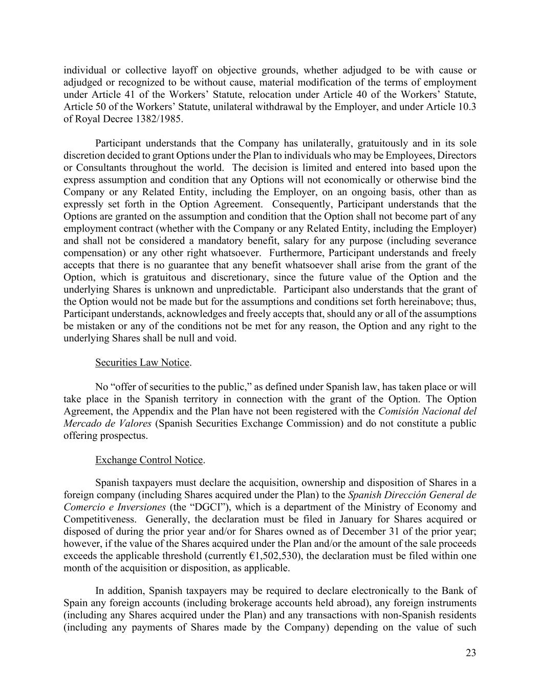23 individual or collective layoff on objective grounds, whether adjudged to be with cause or adjudged or recognized to be without cause, material modification of the terms of employment under Article 41 of the Workers’ Statute, relocation under Article 40 of the Workers’ Statute, Article 50 of the Workers’ Statute, unilateral withdrawal by the Employer, and under Article 10.3 of Royal Decree 1382/1985. Participant understands that the Company has unilaterally, gratuitously and in its sole discretion decided to grant Options under the Plan to individuals who may be Employees, Directors or Consultants throughout the world. The decision is limited and entered into based upon the express assumption and condition that any Options will not economically or otherwise bind the Company or any Related Entity, including the Employer, on an ongoing basis, other than as expressly set forth in the Option Agreement. Consequently, Participant understands that the Options are granted on the assumption and condition that the Option shall not become part of any employment contract (whether with the Company or any Related Entity, including the Employer) and shall not be considered a mandatory benefit, salary for any purpose (including severance compensation) or any other right whatsoever. Furthermore, Participant understands and freely accepts that there is no guarantee that any benefit whatsoever shall arise from the grant of the Option, which is gratuitous and discretionary, since the future value of the Option and the underlying Shares is unknown and unpredictable. Participant also understands that the grant of the Option would not be made but for the assumptions and conditions set forth hereinabove; thus, Participant understands, acknowledges and freely accepts that, should any or all of the assumptions be mistaken or any of the conditions not be met for any reason, the Option and any right to the underlying Shares shall be null and void. Securities Law Notice. No “offer of securities to the public,” as defined under Spanish law, has taken place or will take place in the Spanish territory in connection with the grant of the Option. The Option Agreement, the Appendix and the Plan have not been registered with the Comisión Nacional del Mercado de Valores (Spanish Securities Exchange Commission) and do not constitute a public offering prospectus. Exchange Control Notice. Spanish taxpayers must declare the acquisition, ownership and disposition of Shares in a foreign company (including Shares acquired under the Plan) to the Spanish Dirección General de Comercio e Inversiones (the “DGCI”), which is a department of the Ministry of Economy and Competitiveness. Generally, the declaration must be filed in January for Shares acquired or disposed of during the prior year and/or for Shares owned as of December 31 of the prior year; however, if the value of the Shares acquired under the Plan and/or the amount of the sale proceeds exceeds the applicable threshold (currently €1,502,530), the declaration must be filed within one month of the acquisition or disposition, as applicable. In addition, Spanish taxpayers may be required to declare electronically to the Bank of Spain any foreign accounts (including brokerage accounts held abroad), any foreign instruments (including any Shares acquired under the Plan) and any transactions with non-Spanish residents (including any payments of Shares made by the Company) depending on the value of such