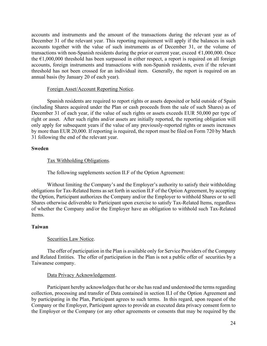 24 accounts and instruments and the amount of the transactions during the relevant year as of December 31 of the relevant year. This reporting requirement will apply if the balances in such accounts together with the value of such instruments as of December 31, or the volume of transactions with non-Spanish residents during the prior or current year, exceed €1,000,000. Once the €1,000,000 threshold has been surpassed in either respect, a report is required on all foreign accounts, foreign instruments and transactions with non-Spanish residents, even if the relevant threshold has not been crossed for an individual item. Generally, the report is required on an annual basis (by January 20 of each year). Foreign Asset/Account Reporting Notice. Spanish residents are required to report rights or assets deposited or held outside of Spain (including Shares acquired under the Plan or cash proceeds from the sale of such Shares) as of December 31 of each year, if the value of such rights or assets exceeds EUR 50,000 per type of right or asset. After such rights and/or assets are initially reported, the reporting obligation will only apply for subsequent years if the value of any previously-reported rights or assets increases by more than EUR 20,000. If reporting is required, the report must be filed on Form 720 by March 31 following the end of the relevant year. Sweden Tax Withholding Obligations. The following supplements section II.F of the Option Agreement: Without limiting the Company’s and the Employer’s authority to satisfy their withholding obligations for Tax-Related Items as set forth in section II.F of the Option Agreement, by accepting the Option, Participant authorizes the Company and/or the Employer to withhold Shares or to sell Shares otherwise deliverable to Participant upon exercise to satisfy Tax-Related Items, regardless of whether the Company and/or the Employer have an obligation to withhold such Tax-Related Items. Taiwan Securities Law Notice. The offer of participation in the Plan is available only for Service Providers of the Company and Related Entities. The offer of participation in the Plan is not a public offer of securities by a Taiwanese company. Data Privacy Acknowledgement. Participant hereby acknowledges that he or she has read and understood the terms regarding collection, processing and transfer of Data contained in section II.I of the Option Agreement and by participating in the Plan, Participant agrees to such terms. In this regard, upon request of the Company or the Employer, Participant agrees to provide an executed data privacy consent form to the Employer or the Company (or any other agreements or consents that may be required by the