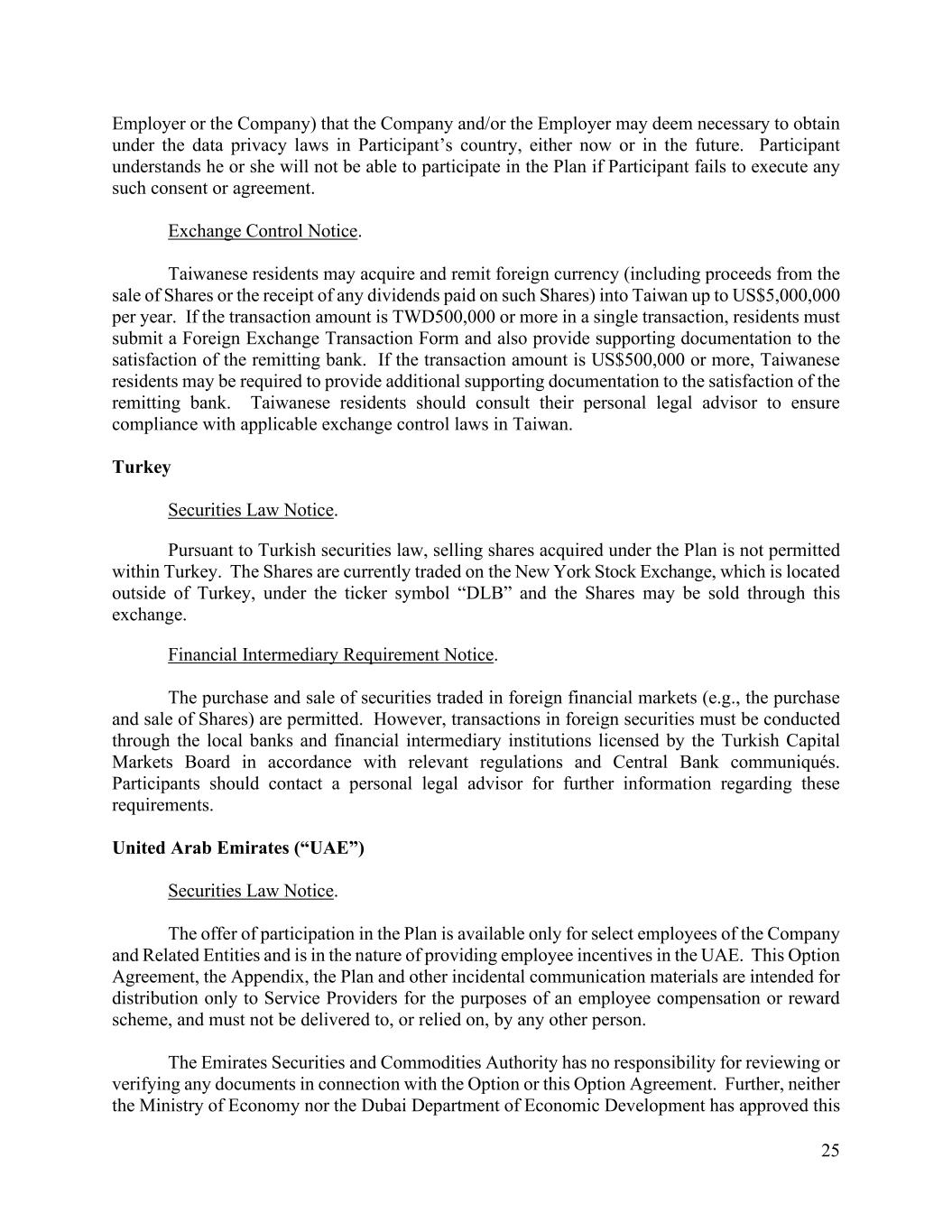 25 Employer or the Company) that the Company and/or the Employer may deem necessary to obtain under the data privacy laws in Participant’s country, either now or in the future. Participant understands he or she will not be able to participate in the Plan if Participant fails to execute any such consent or agreement. Exchange Control Notice. Taiwanese residents may acquire and remit foreign currency (including proceeds from the sale of Shares or the receipt of any dividends paid on such Shares) into Taiwan up to US$5,000,000 per year. If the transaction amount is TWD500,000 or more in a single transaction, residents must submit a Foreign Exchange Transaction Form and also provide supporting documentation to the satisfaction of the remitting bank. If the transaction amount is US$500,000 or more, Taiwanese residents may be required to provide additional supporting documentation to the satisfaction of the remitting bank. Taiwanese residents should consult their personal legal advisor to ensure compliance with applicable exchange control laws in Taiwan. Turkey Securities Law Notice. Pursuant to Turkish securities law, selling shares acquired under the Plan is not permitted within Turkey. The Shares are currently traded on the New York Stock Exchange, which is located outside of Turkey, under the ticker symbol “DLB” and the Shares may be sold through this exchange. Financial Intermediary Requirement Notice. The purchase and sale of securities traded in foreign financial markets (e.g., the purchase and sale of Shares) are permitted. However, transactions in foreign securities must be conducted through the local banks and financial intermediary institutions licensed by the Turkish Capital Markets Board in accordance with relevant regulations and Central Bank communiqués. Participants should contact a personal legal advisor for further information regarding these requirements. United Arab Emirates (“UAE”) Securities Law Notice. The offer of participation in the Plan is available only for select employees of the Company and Related Entities and is in the nature of providing employee incentives in the UAE. This Option Agreement, the Appendix, the Plan and other incidental communication materials are intended for distribution only to Service Providers for the purposes of an employee compensation or reward scheme, and must not be delivered to, or relied on, by any other person. The Emirates Securities and Commodities Authority has no responsibility for reviewing or verifying any documents in connection with the Option or this Option Agreement. Further, neither the Ministry of Economy nor the Dubai Department of Economic Development has approved this