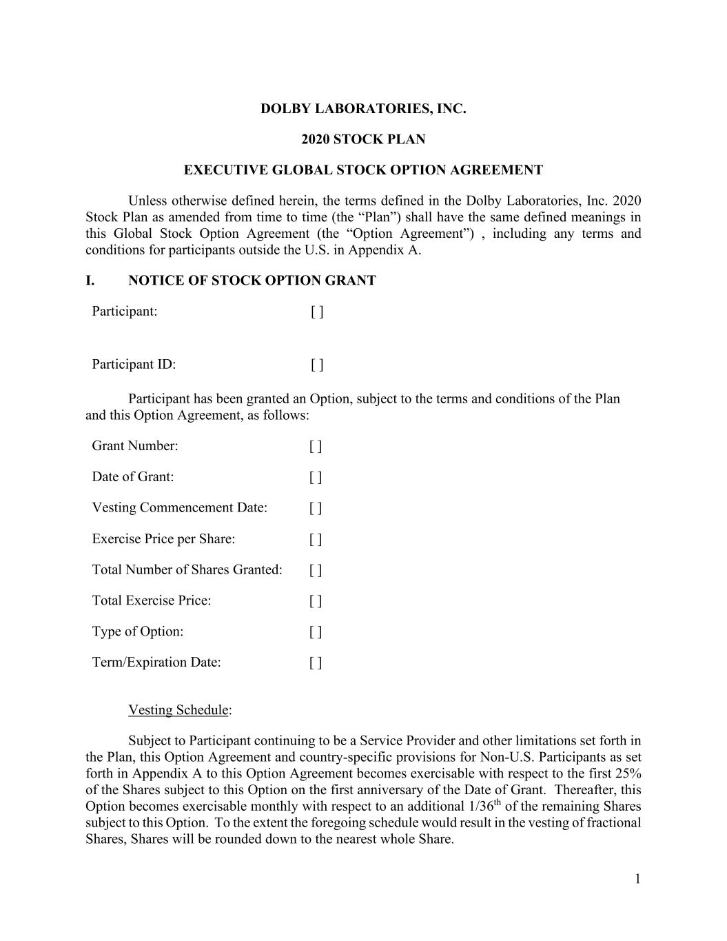 1 DOLBY LABORATORIES, INC. 2020 STOCK PLAN EXECUTIVE GLOBAL STOCK OPTION AGREEMENT Unless otherwise defined herein, the terms defined in the Dolby Laboratories, Inc. 2020 Stock Plan as amended from time to time (the “Plan”) shall have the same defined meanings in this Global Stock Option Agreement (the “Option Agreement”) , including any terms and conditions for participants outside the U.S. in Appendix A. I. NOTICE OF STOCK OPTION GRANT Participant: [ ] Participant ID: [ ] Participant has been granted an Option, subject to the terms and conditions of the Plan and this Option Agreement, as follows: Grant Number: [ ] Date of Grant: [ ] Vesting Commencement Date: [ ] Exercise Price per Share: [ ] Total Number of Shares Granted: [ ] Total Exercise Price: [ ] Type of Option: [ ] Term/Expiration Date: [ ] Vesting Schedule: Subject to Participant continuing to be a Service Provider and other limitations set forth in the Plan, this Option Agreement and country-specific provisions for Non-U.S. Participants as set forth in Appendix A to this Option Agreement becomes exercisable with respect to the first 25% of the Shares subject to this Option on the first anniversary of the Date of Grant. Thereafter, this Option becomes exercisable monthly with respect to an additional 1/36th of the remaining Shares subject to this Option. To the extent the foregoing schedule would result in the vesting of fractional Shares, Shares will be rounded down to the nearest whole Share.