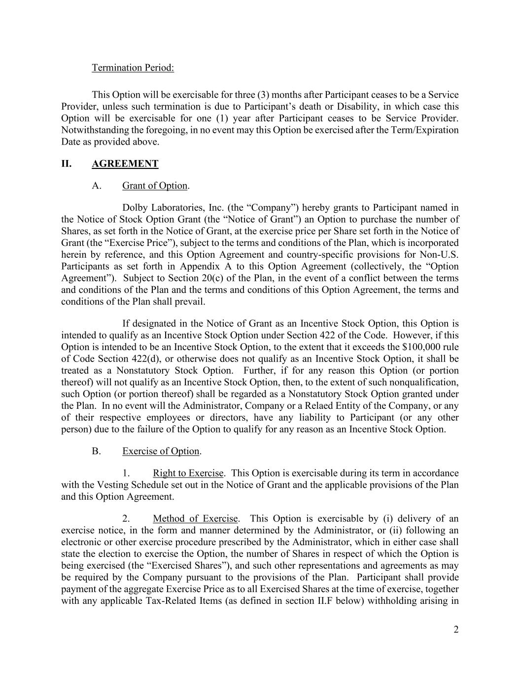 2 Termination Period: This Option will be exercisable for three (3) months after Participant ceases to be a Service Provider, unless such termination is due to Participant’s death or Disability, in which case this Option will be exercisable for one (1) year after Participant ceases to be Service Provider. Notwithstanding the foregoing, in no event may this Option be exercised after the Term/Expiration Date as provided above. II. AGREEMENT A. Grant of Option. Dolby Laboratories, Inc. (the “Company”) hereby grants to Participant named in the Notice of Stock Option Grant (the “Notice of Grant”) an Option to purchase the number of Shares, as set forth in the Notice of Grant, at the exercise price per Share set forth in the Notice of Grant (the “Exercise Price”), subject to the terms and conditions of the Plan, which is incorporated herein by reference, and this Option Agreement and country-specific provisions for Non-U.S. Participants as set forth in Appendix A to this Option Agreement (collectively, the “Option Agreement”). Subject to Section 20(c) of the Plan, in the event of a conflict between the terms and conditions of the Plan and the terms and conditions of this Option Agreement, the terms and conditions of the Plan shall prevail. If designated in the Notice of Grant as an Incentive Stock Option, this Option is intended to qualify as an Incentive Stock Option under Section 422 of the Code. However, if this Option is intended to be an Incentive Stock Option, to the extent that it exceeds the $100,000 rule of Code Section 422(d), or otherwise does not qualify as an Incentive Stock Option, it shall be treated as a Nonstatutory Stock Option. Further, if for any reason this Option (or portion thereof) will not qualify as an Incentive Stock Option, then, to the extent of such nonqualification, such Option (or portion thereof) shall be regarded as a Nonstatutory Stock Option granted under the Plan. In no event will the Administrator, Company or a Relaed Entity of the Company, or any of their respective employees or directors, have any liability to Participant (or any other person) due to the failure of the Option to qualify for any reason as an Incentive Stock Option. B. Exercise of Option. 1. Right to Exercise. This Option is exercisable during its term in accordance with the Vesting Schedule set out in the Notice of Grant and the applicable provisions of the Plan and this Option Agreement. 2. Method of Exercise. This Option is exercisable by (i) delivery of an exercise notice, in the form and manner determined by the Administrator, or (ii) following an electronic or other exercise procedure prescribed by the Administrator, which in either case shall state the election to exercise the Option, the number of Shares in respect of which the Option is being exercised (the “Exercised Shares”), and such other representations and agreements as may be required by the Company pursuant to the provisions of the Plan. Participant shall provide payment of the aggregate Exercise Price as to all Exercised Shares at the time of exercise, together with any applicable Tax-Related Items (as defined in section II.F below) withholding arising in
