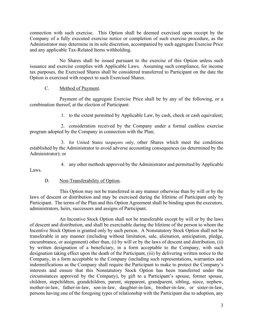 3 connection with such exercise. This Option shall be deemed exercised upon receipt by the Company of a fully executed exercise notice or completion of such exercise procedure, as the Administrator may determine in its sole discretion, accompanied by such aggregate Exercise Price and any applicable Tax-Related Items withholding. No Shares shall be issued pursuant to the exercise of this Option unless such issuance and exercise complies with Applicable Laws. Assuming such compliance, for income tax purposes, the Exercised Shares shall be considered transferred to Participant on the date the Option is exercised with respect to such Exercised Shares. C. Method of Payment. Payment of the aggregate Exercise Price shall be by any of the following, or a combination thereof, at the election of Participant: 1. to the extent permitted by Applicable Law, by cash, check or cash equivalent; 2. consideration received by the Company under a formal cashless exercise program adopted by the Company in connection with the Plan; 3. for United States taxpayers only, other Shares which meet the conditions established by the Administrator to avoid adverse accounting consequences (as determined by the Administrator); or 4. any other methods approved by the Administrator and permitted by Applicable Laws. D. Non-Transferability of Option. This Option may not be transferred in any manner otherwise than by will or by the laws of descent or distribution and may be exercised during the lifetime of Participant only by Participant. The terms of the Plan and this Option Agreement shall be binding upon the executors, administrators, heirs, successors and assigns of Participant. An Incentive Stock Option shall not be transferable except by will or by the laws of descent and distribution, and shall be exercisable during the lifetime of the person to whom the Incentive Stock Option is granted only by such person. A Nonstatutory Stock Option shall not be transferable in any manner (including without limitation, sale, alienation, anticipation, pledge, encumbrance, or assignment) other than, (i) by will or by the laws of descent and distribution, (ii) by written designation of a beneficiary, in a form acceptable to the Company, with such designation taking effect upon the death of the Participant, (iii) by delivering written notice to the Company, in a form acceptable to the Company (including such representations, warranties and indemnifications as the Company shall require the Participant to make to protect the Company’s interests and ensure that this Nonstatutory Stock Option has been transferred under the circumstances approved by the Company), by gift to a Participant’s spouse, former spouse, children, stepchildren, grandchildren, parent, stepparent, grandparent, sibling, niece, nephew, mother-in-law, father-in-law, son-in-law, daughter-in-law, brother-in-law, or sister-in-law, persons having one of the foregoing types of relationship with the Participant due to adoption, any