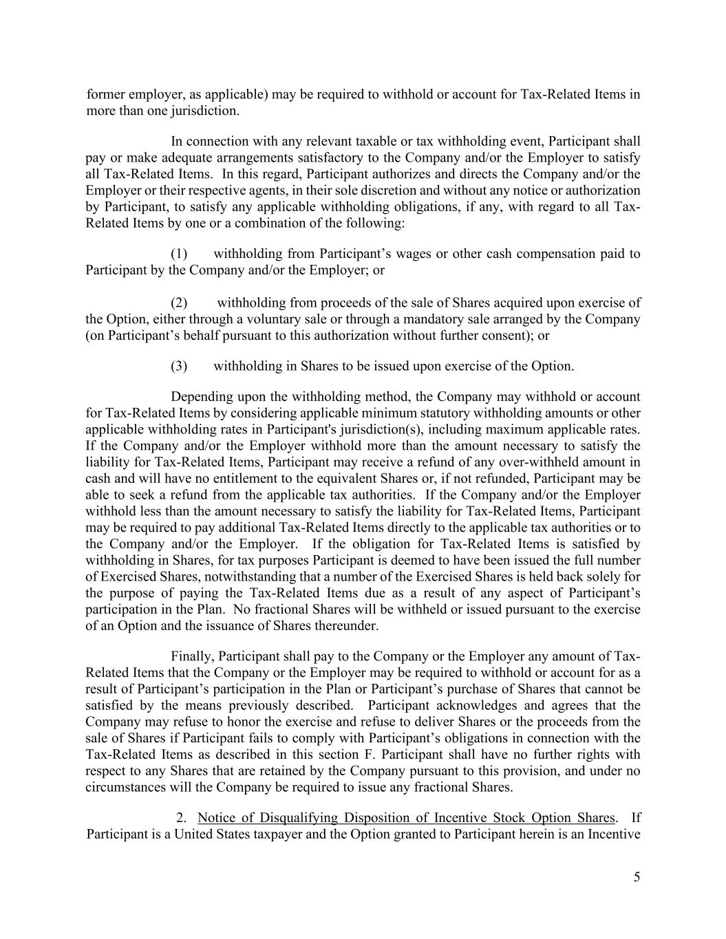 5 former employer, as applicable) may be required to withhold or account for Tax-Related Items in more than one jurisdiction. In connection with any relevant taxable or tax withholding event, Participant shall pay or make adequate arrangements satisfactory to the Company and/or the Employer to satisfy all Tax-Related Items. In this regard, Participant authorizes and directs the Company and/or the Employer or their respective agents, in their sole discretion and without any notice or authorization by Participant, to satisfy any applicable withholding obligations, if any, with regard to all Tax- Related Items by one or a combination of the following: (1) withholding from Participant’s wages or other cash compensation paid to Participant by the Company and/or the Employer; or (2) withholding from proceeds of the sale of Shares acquired upon exercise of the Option, either through a voluntary sale or through a mandatory sale arranged by the Company (on Participant’s behalf pursuant to this authorization without further consent); or (3) withholding in Shares to be issued upon exercise of the Option. Depending upon the withholding method, the Company may withhold or account for Tax-Related Items by considering applicable minimum statutory withholding amounts or other applicable withholding rates in Participant's jurisdiction(s), including maximum applicable rates. If the Company and/or the Employer withhold more than the amount necessary to satisfy the liability for Tax-Related Items, Participant may receive a refund of any over-withheld amount in cash and will have no entitlement to the equivalent Shares or, if not refunded, Participant may be able to seek a refund from the applicable tax authorities. If the Company and/or the Employer withhold less than the amount necessary to satisfy the liability for Tax-Related Items, Participant may be required to pay additional Tax-Related Items directly to the applicable tax authorities or to the Company and/or the Employer. If the obligation for Tax-Related Items is satisfied by withholding in Shares, for tax purposes Participant is deemed to have been issued the full number of Exercised Shares, notwithstanding that a number of the Exercised Shares is held back solely for the purpose of paying the Tax-Related Items due as a result of any aspect of Participant’s participation in the Plan. No fractional Shares will be withheld or issued pursuant to the exercise of an Option and the issuance of Shares thereunder. Finally, Participant shall pay to the Company or the Employer any amount of Tax- Related Items that the Company or the Employer may be required to withhold or account for as a result of Participant’s participation in the Plan or Participant’s purchase of Shares that cannot be satisfied by the means previously described. Participant acknowledges and agrees that the Company may refuse to honor the exercise and refuse to deliver Shares or the proceeds from the sale of Shares if Participant fails to comply with Participant’s obligations in connection with the Tax-Related Items as described in this section F. Participant shall have no further rights with respect to any Shares that are retained by the Company pursuant to this provision, and under no circumstances will the Company be required to issue any fractional Shares. 2. Notice of Disqualifying Disposition of Incentive Stock Option Shares. If Participant is a United States taxpayer and the Option granted to Participant herein is an Incentive