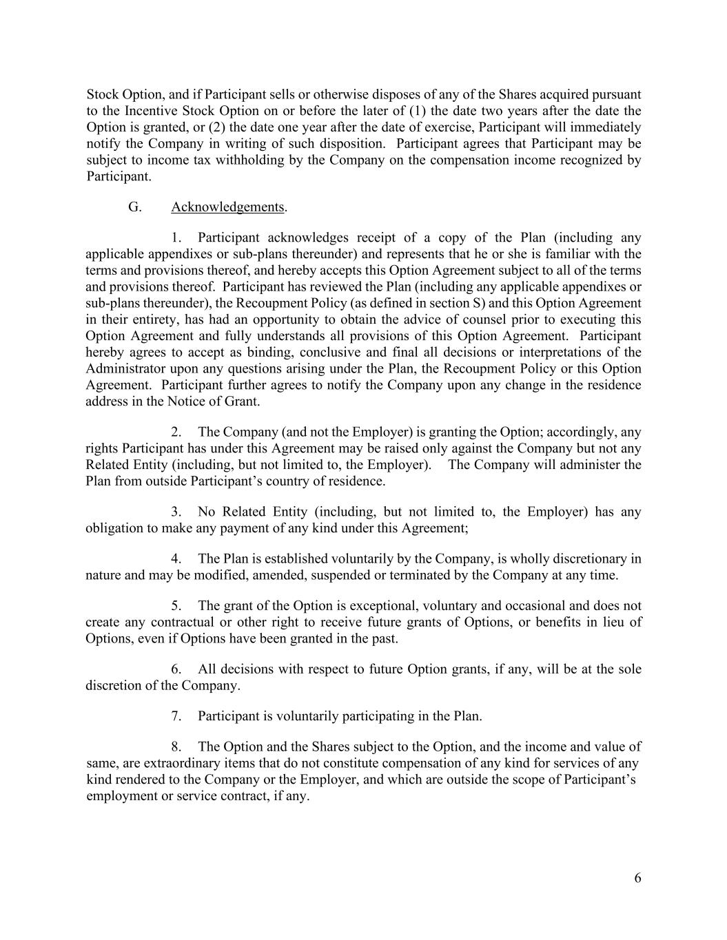 6 Stock Option, and if Participant sells or otherwise disposes of any of the Shares acquired pursuant to the Incentive Stock Option on or before the later of (1) the date two years after the date the Option is granted, or (2) the date one year after the date of exercise, Participant will immediately notify the Company in writing of such disposition. Participant agrees that Participant may be subject to income tax withholding by the Company on the compensation income recognized by Participant. G. Acknowledgements. 1. Participant acknowledges receipt of a copy of the Plan (including any applicable appendixes or sub-plans thereunder) and represents that he or she is familiar with the terms and provisions thereof, and hereby accepts this Option Agreement subject to all of the terms and provisions thereof. Participant has reviewed the Plan (including any applicable appendixes or sub-plans thereunder), the Recoupment Policy (as defined in section S) and this Option Agreement in their entirety, has had an opportunity to obtain the advice of counsel prior to executing this Option Agreement and fully understands all provisions of this Option Agreement. Participant hereby agrees to accept as binding, conclusive and final all decisions or interpretations of the Administrator upon any questions arising under the Plan, the Recoupment Policy or this Option Agreement. Participant further agrees to notify the Company upon any change in the residence address in the Notice of Grant. 2. The Company (and not the Employer) is granting the Option; accordingly, any rights Participant has under this Agreement may be raised only against the Company but not any Related Entity (including, but not limited to, the Employer). The Company will administer the Plan from outside Participant’s country of residence. 3. No Related Entity (including, but not limited to, the Employer) has any obligation to make any payment of any kind under this Agreement; 4. The Plan is established voluntarily by the Company, is wholly discretionary in nature and may be modified, amended, suspended or terminated by the Company at any time. 5. The grant of the Option is exceptional, voluntary and occasional and does not create any contractual or other right to receive future grants of Options, or benefits in lieu of Options, even if Options have been granted in the past. 6. All decisions with respect to future Option grants, if any, will be at the sole discretion of the Company. 7. Participant is voluntarily participating in the Plan. 8. The Option and the Shares subject to the Option, and the income and value of same, are extraordinary items that do not constitute compensation of any kind for services of any kind rendered to the Company or the Employer, and which are outside the scope of Participant’s employment or service contract, if any.