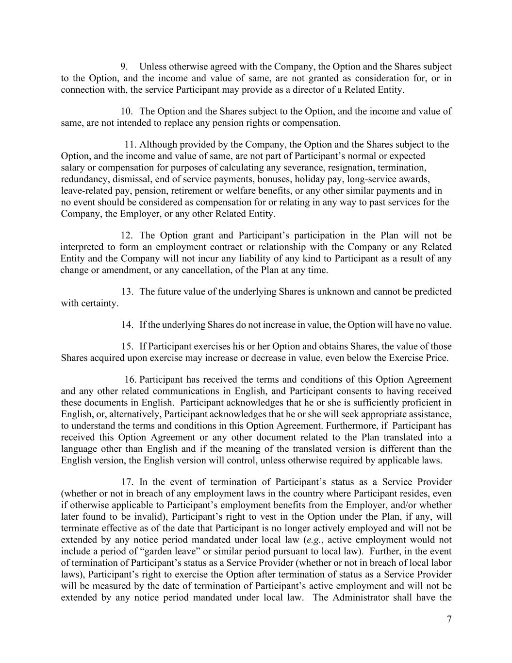7 9. Unless otherwise agreed with the Company, the Option and the Shares subject to the Option, and the income and value of same, are not granted as consideration for, or in connection with, the service Participant may provide as a director of a Related Entity. 10. The Option and the Shares subject to the Option, and the income and value of same, are not intended to replace any pension rights or compensation. 11. Although provided by the Company, the Option and the Shares subject to the Option, and the income and value of same, are not part of Participant’s normal or expected salary or compensation for purposes of calculating any severance, resignation, termination, redundancy, dismissal, end of service payments, bonuses, holiday pay, long-service awards, leave-related pay, pension, retirement or welfare benefits, or any other similar payments and in no event should be considered as compensation for or relating in any way to past services for the Company, the Employer, or any other Related Entity. 12. The Option grant and Participant’s participation in the Plan will not be interpreted to form an employment contract or relationship with the Company or any Related Entity and the Company will not incur any liability of any kind to Participant as a result of any change or amendment, or any cancellation, of the Plan at any time. 13. The future value of the underlying Shares is unknown and cannot be predicted with certainty. 14. If the underlying Shares do not increase in value, the Option will have no value. 15. If Participant exercises his or her Option and obtains Shares, the value of those Shares acquired upon exercise may increase or decrease in value, even below the Exercise Price. 16. Participant has received the terms and conditions of this Option Agreement and any other related communications in English, and Participant consents to having received these documents in English. Participant acknowledges that he or she is sufficiently proficient in English, or, alternatively, Participant acknowledges that he or she will seek appropriate assistance, to understand the terms and conditions in this Option Agreement. Furthermore, if Participant has received this Option Agreement or any other document related to the Plan translated into a language other than English and if the meaning of the translated version is different than the English version, the English version will control, unless otherwise required by applicable laws. 17. In the event of termination of Participant’s status as a Service Provider (whether or not in breach of any employment laws in the country where Participant resides, even if otherwise applicable to Participant’s employment benefits from the Employer, and/or whether later found to be invalid), Participant’s right to vest in the Option under the Plan, if any, will terminate effective as of the date that Participant is no longer actively employed and will not be extended by any notice period mandated under local law (e.g., active employment would not include a period of “garden leave” or similar period pursuant to local law). Further, in the event of termination of Participant’s status as a Service Provider (whether or not in breach of local labor laws), Participant’s right to exercise the Option after termination of status as a Service Provider will be measured by the date of termination of Participant’s active employment and will not be extended by any notice period mandated under local law. The Administrator shall have the