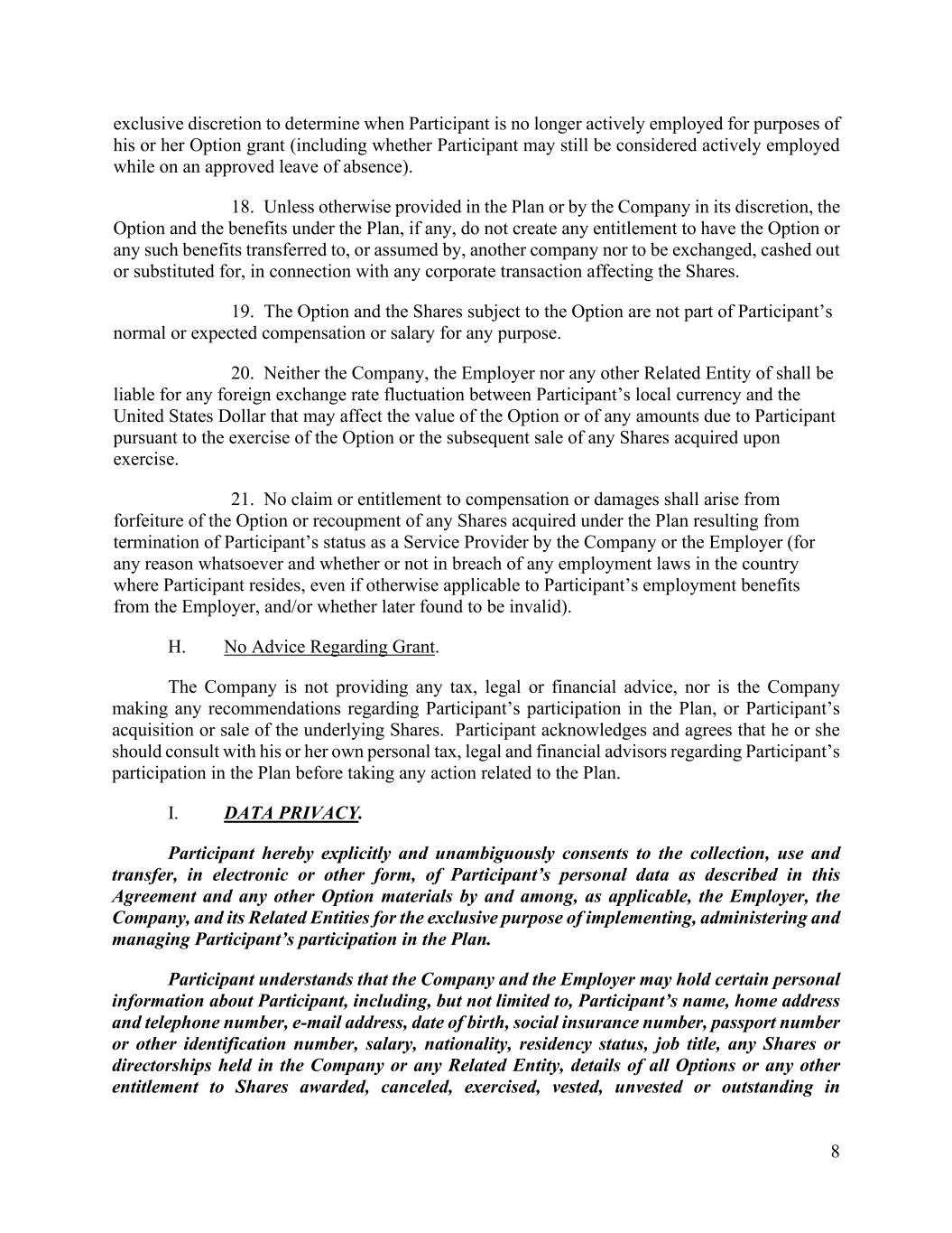 8 exclusive discretion to determine when Participant is no longer actively employed for purposes of his or her Option grant (including whether Participant may still be considered actively employed while on an approved leave of absence). 18. Unless otherwise provided in the Plan or by the Company in its discretion, the Option and the benefits under the Plan, if any, do not create any entitlement to have the Option or any such benefits transferred to, or assumed by, another company nor to be exchanged, cashed out or substituted for, in connection with any corporate transaction affecting the Shares. 19. The Option and the Shares subject to the Option are not part of Participant’s normal or expected compensation or salary for any purpose. 20. Neither the Company, the Employer nor any other Related Entity of shall be liable for any foreign exchange rate fluctuation between Participant’s local currency and the United States Dollar that may affect the value of the Option or of any amounts due to Participant pursuant to the exercise of the Option or the subsequent sale of any Shares acquired upon exercise. 21. No claim or entitlement to compensation or damages shall arise from forfeiture of the Option or recoupment of any Shares acquired under the Plan resulting from termination of Participant’s status as a Service Provider by the Company or the Employer (for any reason whatsoever and whether or not in breach of any employment laws in the country where Participant resides, even if otherwise applicable to Participant’s employment benefits from the Employer, and/or whether later found to be invalid). H. No Advice Regarding Grant. The Company is not providing any tax, legal or financial advice, nor is the Company making any recommendations regarding Participant’s participation in the Plan, or Participant’s acquisition or sale of the underlying Shares. Participant acknowledges and agrees that he or she should consult with his or her own personal tax, legal and financial advisors regarding Participant’s participation in the Plan before taking any action related to the Plan. I. DATA PRIVACY. Participant hereby explicitly and unambiguously consents to the collection, use and transfer, in electronic or other form, of Participant’s personal data as described in this Agreement and any other Option materials by and among, as applicable, the Employer, the Company, and its Related Entities for the exclusive purpose of implementing, administering and managing Participant’s participation in the Plan. Participant understands that the Company and the Employer may hold certain personal information about Participant, including, but not limited to, Participant’s name, home address and telephone number, e-mail address, date of birth, social insurance number, passport number or other identification number, salary, nationality, residency status, job title, any Shares or directorships held in the Company or any Related Entity, details of all Options or any other entitlement to Shares awarded, canceled, exercised, vested, unvested or outstanding in