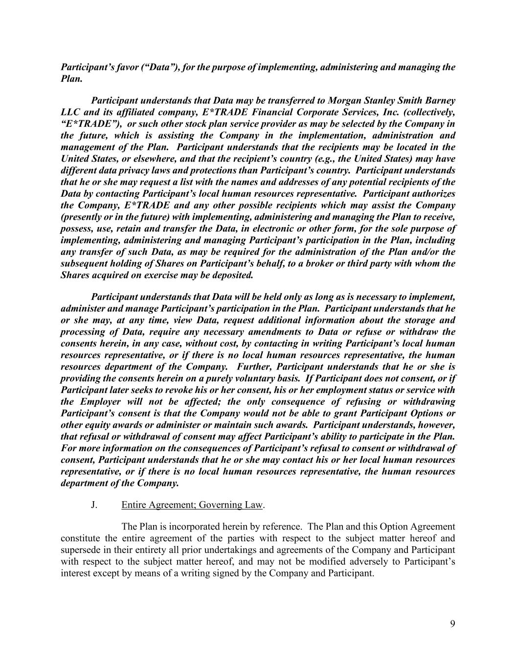 9 Participant’s favor (“Data”), for the purpose of implementing, administering and managing the Plan. Participant understands that Data may be transferred to Morgan Stanley Smith Barney LLC and its affiliated company, E*TRADE Financial Corporate Services, Inc. (collectively, “E*TRADE”), or such other stock plan service provider as may be selected by the Company in the future, which is assisting the Company in the implementation, administration and management of the Plan. Participant understands that the recipients may be located in the United States, or elsewhere, and that the recipient’s country (e.g., the United States) may have different data privacy laws and protections than Participant’s country. Participant understands that he or she may request a list with the names and addresses of any potential recipients of the Data by contacting Participant’s local human resources representative. Participant authorizes the Company, E*TRADE and any other possible recipients which may assist the Company (presently or in the future) with implementing, administering and managing the Plan to receive, possess, use, retain and transfer the Data, in electronic or other form, for the sole purpose of implementing, administering and managing Participant’s participation in the Plan, including any transfer of such Data, as may be required for the administration of the Plan and/or the subsequent holding of Shares on Participant’s behalf, to a broker or third party with whom the Shares acquired on exercise may be deposited. Participant understands that Data will be held only as long as is necessary to implement, administer and manage Participant’s participation in the Plan. Participant understands that he or she may, at any time, view Data, request additional information about the storage and processing of Data, require any necessary amendments to Data or refuse or withdraw the consents herein, in any case, without cost, by contacting in writing Participant’s local human resources representative, or if there is no local human resources representative, the human resources department of the Company. Further, Participant understands that he or she is providing the consents herein on a purely voluntary basis. If Participant does not consent, or if Participant later seeks to revoke his or her consent, his or her employment status or service with the Employer will not be affected; the only consequence of refusing or withdrawing Participant’s consent is that the Company would not be able to grant Participant Options or other equity awards or administer or maintain such awards. Participant understands, however, that refusal or withdrawal of consent may affect Participant’s ability to participate in the Plan. For more information on the consequences of Participant’s refusal to consent or withdrawal of consent, Participant understands that he or she may contact his or her local human resources representative, or if there is no local human resources representative, the human resources department of the Company. J. Entire Agreement; Governing Law. The Plan is incorporated herein by reference. The Plan and this Option Agreement constitute the entire agreement of the parties with respect to the subject matter hereof and supersede in their entirety all prior undertakings and agreements of the Company and Participant with respect to the subject matter hereof, and may not be modified adversely to Participant’s interest except by means of a writing signed by the Company and Participant.