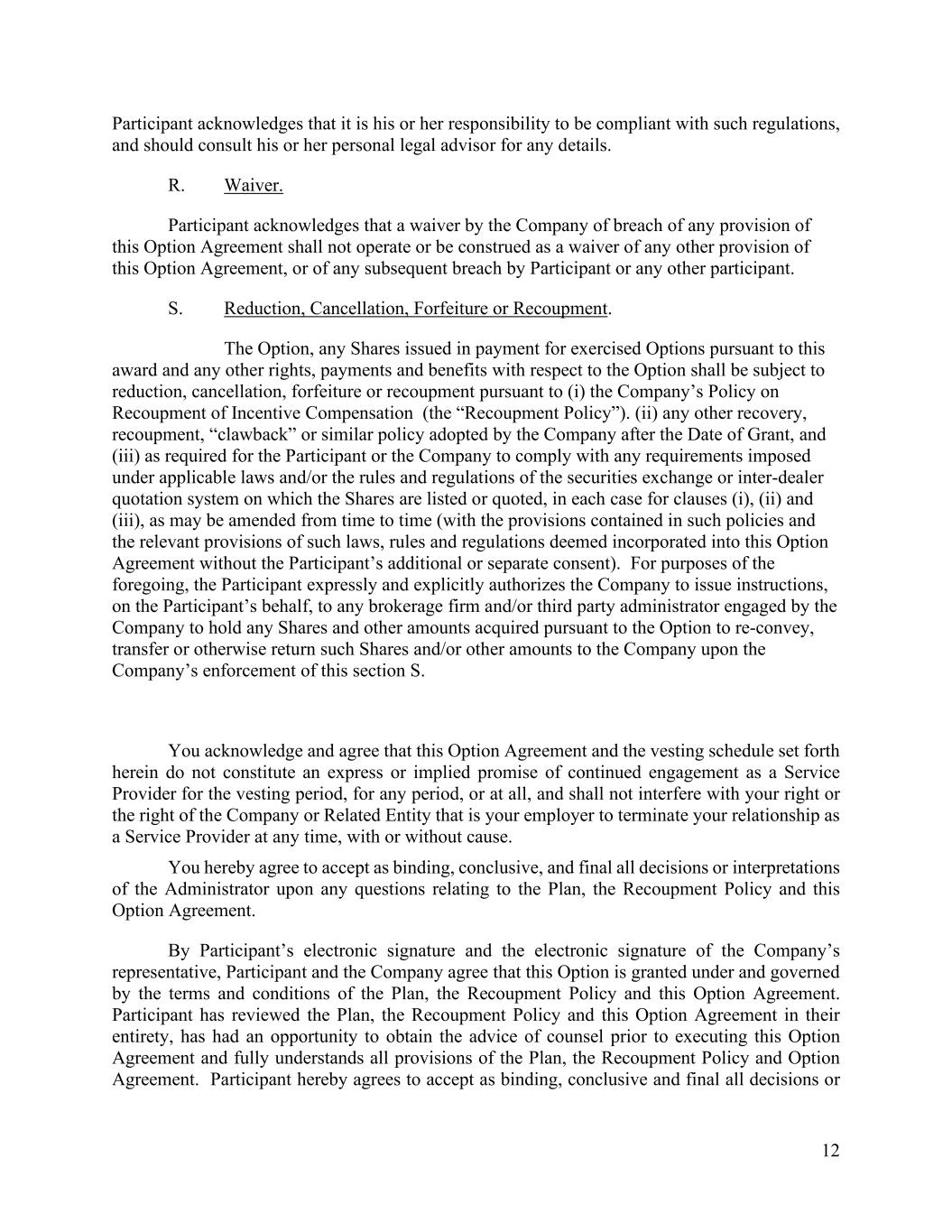12 Participant acknowledges that it is his or her responsibility to be compliant with such regulations, and should consult his or her personal legal advisor for any details. R. Waiver. Participant acknowledges that a waiver by the Company of breach of any provision of this Option Agreement shall not operate or be construed as a waiver of any other provision of this Option Agreement, or of any subsequent breach by Participant or any other participant. S. Reduction, Cancellation, Forfeiture or Recoupment. The Option, any Shares issued in payment for exercised Options pursuant to this award and any other rights, payments and benefits with respect to the Option shall be subject to reduction, cancellation, forfeiture or recoupment pursuant to (i) the Company’s Policy on Recoupment of Incentive Compensation (the “Recoupment Policy”). (ii) any other recovery, recoupment, “clawback” or similar policy adopted by the Company after the Date of Grant, and (iii) as required for the Participant or the Company to comply with any requirements imposed under applicable laws and/or the rules and regulations of the securities exchange or inter-dealer quotation system on which the Shares are listed or quoted, in each case for clauses (i), (ii) and (iii), as may be amended from time to time (with the provisions contained in such policies and the relevant provisions of such laws, rules and regulations deemed incorporated into this Option Agreement without the Participant’s additional or separate consent). For purposes of the foregoing, the Participant expressly and explicitly authorizes the Company to issue instructions, on the Participant’s behalf, to any brokerage firm and/or third party administrator engaged by the Company to hold any Shares and other amounts acquired pursuant to the Option to re-convey, transfer or otherwise return such Shares and/or other amounts to the Company upon the Company’s enforcement of this section S. You acknowledge and agree that this Option Agreement and the vesting schedule set forth herein do not constitute an express or implied promise of continued engagement as a Service Provider for the vesting period, for any period, or at all, and shall not interfere with your right or the right of the Company or Related Entity that is your employer to terminate your relationship as a Service Provider at any time, with or without cause. You hereby agree to accept as binding, conclusive, and final all decisions or interpretations of the Administrator upon any questions relating to the Plan, the Recoupment Policy and this Option Agreement. By Participant’s electronic signature and the electronic signature of the Company’s representative, Participant and the Company agree that this Option is granted under and governed by the terms and conditions of the Plan, the Recoupment Policy and this Option Agreement. Participant has reviewed the Plan, the Recoupment Policy and this Option Agreement in their entirety, has had an opportunity to obtain the advice of counsel prior to executing this Option Agreement and fully understands all provisions of the Plan, the Recoupment Policy and Option Agreement. Participant hereby agrees to accept as binding, conclusive and final all decisions or