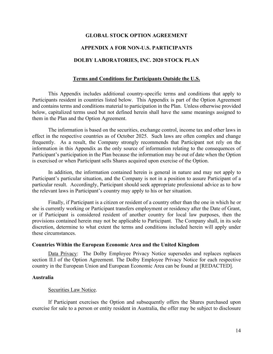 14 GLOBAL STOCK OPTION AGREEMENT APPENDIX A FOR NON-U.S. PARTICIPANTS DOLBY LABORATORIES, INC. 2020 STOCK PLAN Terms and Conditions for Participants Outside the U.S. This Appendix includes additional country-specific terms and conditions that apply to Participants resident in countries listed below. This Appendix is part of the Option Agreement and contains terms and conditions material to participation in the Plan. Unless otherwise provided below, capitalized terms used but not defined herein shall have the same meanings assigned to them in the Plan and the Option Agreement. The information is based on the securities, exchange control, income tax and other laws in effect in the respective countries as of October 2025. Such laws are often complex and change frequently. As a result, the Company strongly recommends that Participant not rely on the information in this Appendix as the only source of information relating to the consequences of Participant’s participation in the Plan because the information may be out of date when the Option is exercised or when Participant sells Shares acquired upon exercise of the Option. In addition, the information contained herein is general in nature and may not apply to Participant’s particular situation, and the Company is not in a position to assure Participant of a particular result. Accordingly, Participant should seek appropriate professional advice as to how the relevant laws in Participant’s country may apply to his or her situation. Finally, if Participant is a citizen or resident of a country other than the one in which he or she is currently working or Participant transfers employment or residency after the Date of Grant, or if Participant is considered resident of another country for local law purposes, then the provisions contained herein may not be applicable to Participant. The Company shall, in its sole discretion, determine to what extent the terms and conditions included herein will apply under these circumstances. Countries Within the European Economic Area and the United Kingdom Data Privacy: The Dolby Employee Privacy Notice supersedes and replaces replaces section II.I of the Option Agreement. The Dolby Employee Privacy Notice for each respective country in the European Union and European Economic Area can be found at [REDACTED]. Australia Securities Law Notice. If Participant exercises the Option and subsequently offers the Shares purchased upon exercise for sale to a person or entity resident in Australia, the offer may be subject to disclosure