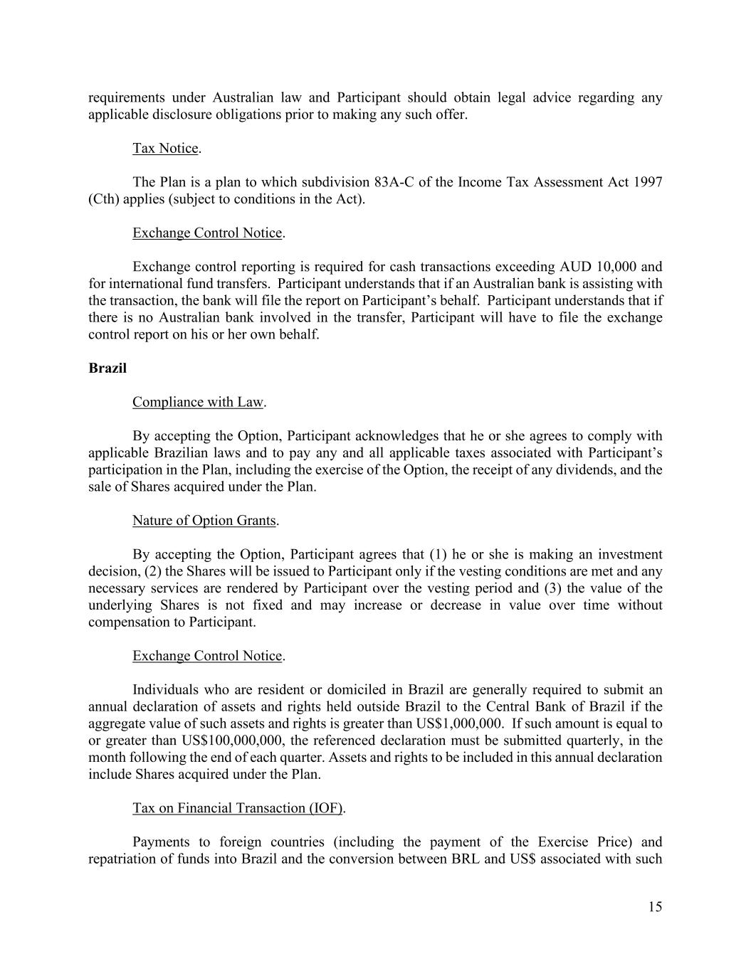 15 requirements under Australian law and Participant should obtain legal advice regarding any applicable disclosure obligations prior to making any such offer. Tax Notice. The Plan is a plan to which subdivision 83A-C of the Income Tax Assessment Act 1997 (Cth) applies (subject to conditions in the Act). Exchange Control Notice. Exchange control reporting is required for cash transactions exceeding AUD 10,000 and for international fund transfers. Participant understands that if an Australian bank is assisting with the transaction, the bank will file the report on Participant’s behalf. Participant understands that if there is no Australian bank involved in the transfer, Participant will have to file the exchange control report on his or her own behalf. Brazil Compliance with Law. By accepting the Option, Participant acknowledges that he or she agrees to comply with applicable Brazilian laws and to pay any and all applicable taxes associated with Participant’s participation in the Plan, including the exercise of the Option, the receipt of any dividends, and the sale of Shares acquired under the Plan. Nature of Option Grants. By accepting the Option, Participant agrees that (1) he or she is making an investment decision, (2) the Shares will be issued to Participant only if the vesting conditions are met and any necessary services are rendered by Participant over the vesting period and (3) the value of the underlying Shares is not fixed and may increase or decrease in value over time without compensation to Participant. Exchange Control Notice. Individuals who are resident or domiciled in Brazil are generally required to submit an annual declaration of assets and rights held outside Brazil to the Central Bank of Brazil if the aggregate value of such assets and rights is greater than US$1,000,000. If such amount is equal to or greater than US$100,000,000, the referenced declaration must be submitted quarterly, in the month following the end of each quarter. Assets and rights to be included in this annual declaration include Shares acquired under the Plan. Tax on Financial Transaction (IOF). Payments to foreign countries (including the payment of the Exercise Price) and repatriation of funds into Brazil and the conversion between BRL and US$ associated with such