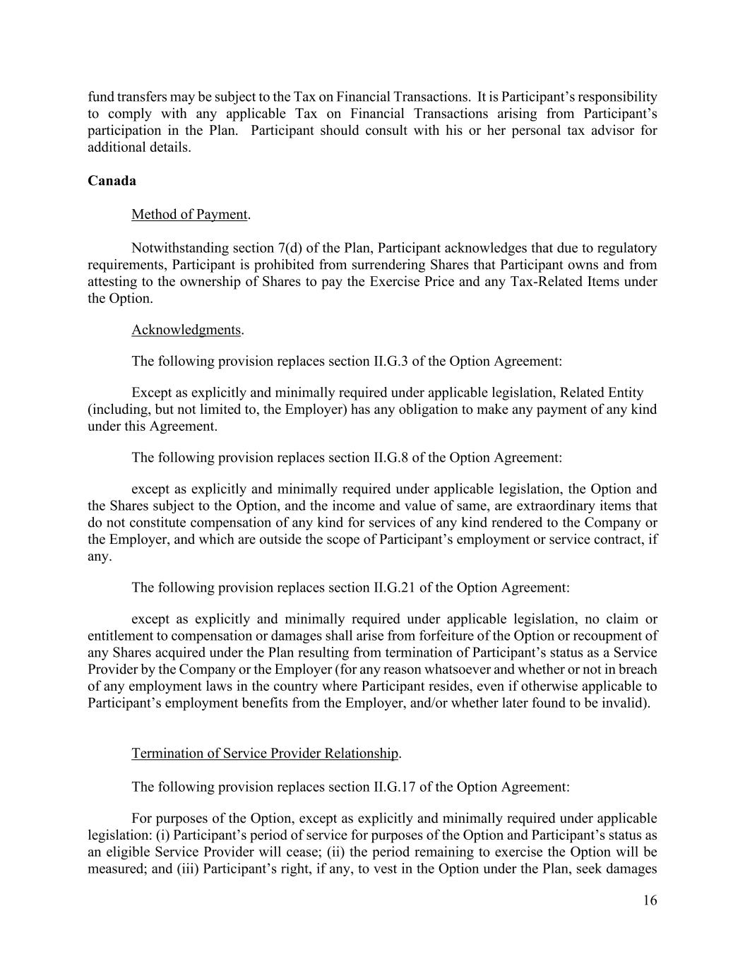 16 fund transfers may be subject to the Tax on Financial Transactions. It is Participant’s responsibility to comply with any applicable Tax on Financial Transactions arising from Participant’s participation in the Plan. Participant should consult with his or her personal tax advisor for additional details. Canada Method of Payment. Notwithstanding section 7(d) of the Plan, Participant acknowledges that due to regulatory requirements, Participant is prohibited from surrendering Shares that Participant owns and from attesting to the ownership of Shares to pay the Exercise Price and any Tax-Related Items under the Option. Acknowledgments. The following provision replaces section II.G.3 of the Option Agreement: Except as explicitly and minimally required under applicable legislation, Related Entity (including, but not limited to, the Employer) has any obligation to make any payment of any kind under this Agreement. The following provision replaces section II.G.8 of the Option Agreement: except as explicitly and minimally required under applicable legislation, the Option and the Shares subject to the Option, and the income and value of same, are extraordinary items that do not constitute compensation of any kind for services of any kind rendered to the Company or the Employer, and which are outside the scope of Participant’s employment or service contract, if any. The following provision replaces section II.G.21 of the Option Agreement: except as explicitly and minimally required under applicable legislation, no claim or entitlement to compensation or damages shall arise from forfeiture of the Option or recoupment of any Shares acquired under the Plan resulting from termination of Participant’s status as a Service Provider by the Company or the Employer (for any reason whatsoever and whether or not in breach of any employment laws in the country where Participant resides, even if otherwise applicable to Participant’s employment benefits from the Employer, and/or whether later found to be invalid). Termination of Service Provider Relationship. The following provision replaces section II.G.17 of the Option Agreement: For purposes of the Option, except as explicitly and minimally required under applicable legislation: (i) Participant’s period of service for purposes of the Option and Participant’s status as an eligible Service Provider will cease; (ii) the period remaining to exercise the Option will be measured; and (iii) Participant’s right, if any, to vest in the Option under the Plan, seek damages