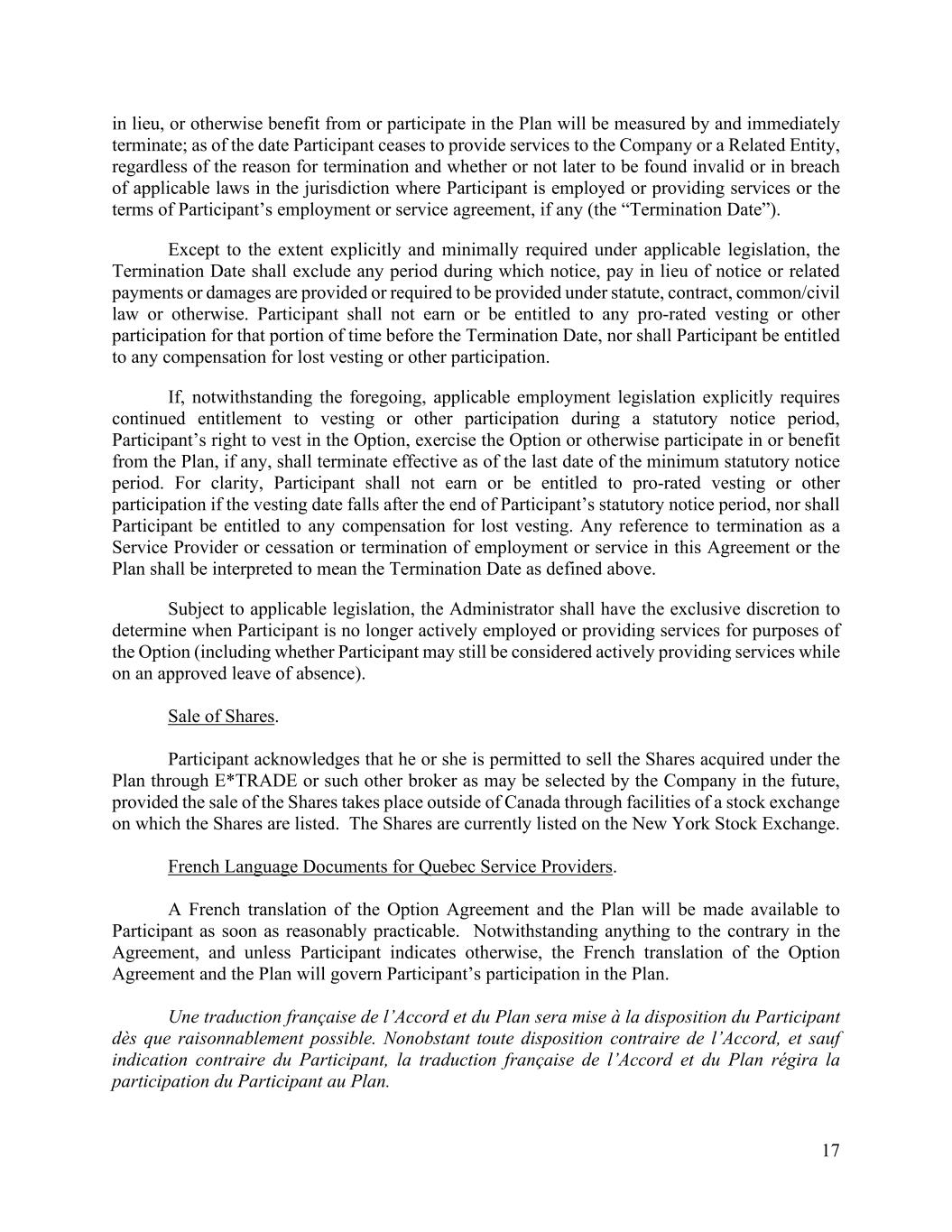 17 in lieu, or otherwise benefit from or participate in the Plan will be measured by and immediately terminate; as of the date Participant ceases to provide services to the Company or a Related Entity, regardless of the reason for termination and whether or not later to be found invalid or in breach of applicable laws in the jurisdiction where Participant is employed or providing services or the terms of Participant’s employment or service agreement, if any (the “Termination Date”). Except to the extent explicitly and minimally required under applicable legislation, the Termination Date shall exclude any period during which notice, pay in lieu of notice or related payments or damages are provided or required to be provided under statute, contract, common/civil law or otherwise. Participant shall not earn or be entitled to any pro-rated vesting or other participation for that portion of time before the Termination Date, nor shall Participant be entitled to any compensation for lost vesting or other participation. If, notwithstanding the foregoing, applicable employment legislation explicitly requires continued entitlement to vesting or other participation during a statutory notice period, Participant’s right to vest in the Option, exercise the Option or otherwise participate in or benefit from the Plan, if any, shall terminate effective as of the last date of the minimum statutory notice period. For clarity, Participant shall not earn or be entitled to pro-rated vesting or other participation if the vesting date falls after the end of Participant’s statutory notice period, nor shall Participant be entitled to any compensation for lost vesting. Any reference to termination as a Service Provider or cessation or termination of employment or service in this Agreement or the Plan shall be interpreted to mean the Termination Date as defined above. Subject to applicable legislation, the Administrator shall have the exclusive discretion to determine when Participant is no longer actively employed or providing services for purposes of the Option (including whether Participant may still be considered actively providing services while on an approved leave of absence). Sale of Shares. Participant acknowledges that he or she is permitted to sell the Shares acquired under the Plan through E*TRADE or such other broker as may be selected by the Company in the future, provided the sale of the Shares takes place outside of Canada through facilities of a stock exchange on which the Shares are listed. The Shares are currently listed on the New York Stock Exchange. French Language Documents for Quebec Service Providers. A French translation of the Option Agreement and the Plan will be made available to Participant as soon as reasonably practicable. Notwithstanding anything to the contrary in the Agreement, and unless Participant indicates otherwise, the French translation of the Option Agreement and the Plan will govern Participant’s participation in the Plan. Une traduction française de l’Accord et du Plan sera mise à la disposition du Participant dès que raisonnablement possible. Nonobstant toute disposition contraire de l’Accord, et sauf indication contraire du Participant, la traduction française de l’Accord et du Plan régira la participation du Participant au Plan.