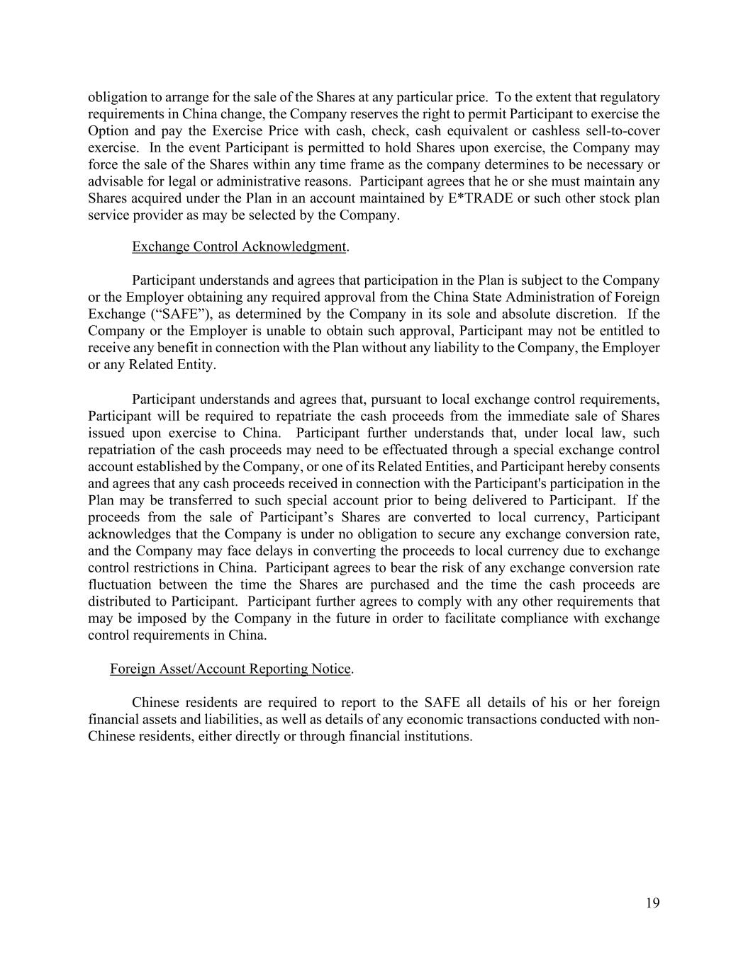 19 obligation to arrange for the sale of the Shares at any particular price. To the extent that regulatory requirements in China change, the Company reserves the right to permit Participant to exercise the Option and pay the Exercise Price with cash, check, cash equivalent or cashless sell-to-cover exercise. In the event Participant is permitted to hold Shares upon exercise, the Company may force the sale of the Shares within any time frame as the company determines to be necessary or advisable for legal or administrative reasons. Participant agrees that he or she must maintain any Shares acquired under the Plan in an account maintained by E*TRADE or such other stock plan service provider as may be selected by the Company. Exchange Control Acknowledgment. Participant understands and agrees that participation in the Plan is subject to the Company or the Employer obtaining any required approval from the China State Administration of Foreign Exchange (“SAFE”), as determined by the Company in its sole and absolute discretion. If the Company or the Employer is unable to obtain such approval, Participant may not be entitled to receive any benefit in connection with the Plan without any liability to the Company, the Employer or any Related Entity. Participant understands and agrees that, pursuant to local exchange control requirements, Participant will be required to repatriate the cash proceeds from the immediate sale of Shares issued upon exercise to China. Participant further understands that, under local law, such repatriation of the cash proceeds may need to be effectuated through a special exchange control account established by the Company, or one of its Related Entities, and Participant hereby consents and agrees that any cash proceeds received in connection with the Participant's participation in the Plan may be transferred to such special account prior to being delivered to Participant. If the proceeds from the sale of Participant’s Shares are converted to local currency, Participant acknowledges that the Company is under no obligation to secure any exchange conversion rate, and the Company may face delays in converting the proceeds to local currency due to exchange control restrictions in China. Participant agrees to bear the risk of any exchange conversion rate fluctuation between the time the Shares are purchased and the time the cash proceeds are distributed to Participant. Participant further agrees to comply with any other requirements that may be imposed by the Company in the future in order to facilitate compliance with exchange control requirements in China. Foreign Asset/Account Reporting Notice. Chinese residents are required to report to the SAFE all details of his or her foreign financial assets and liabilities, as well as details of any economic transactions conducted with non- Chinese residents, either directly or through financial institutions.
