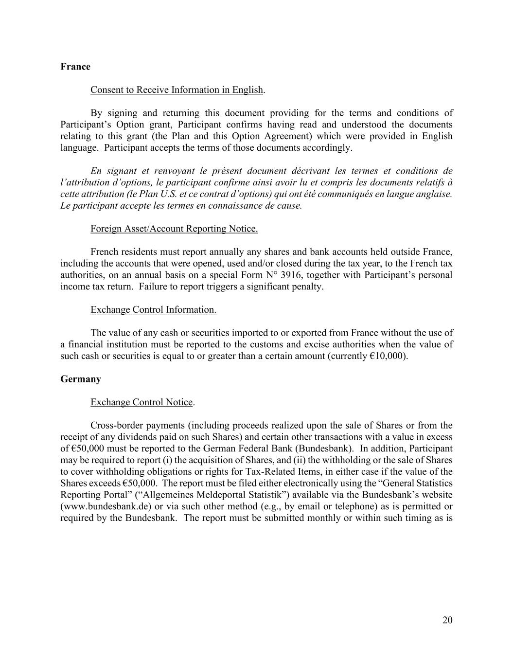 20 France Consent to Receive Information in English. By signing and returning this document providing for the terms and conditions of Participant’s Option grant, Participant confirms having read and understood the documents relating to this grant (the Plan and this Option Agreement) which were provided in English language. Participant accepts the terms of those documents accordingly. En signant et renvoyant le présent document décrivant les termes et conditions de l’attribution d’options, le participant confirme ainsi avoir lu et compris les documents relatifs à cette attribution (le Plan U.S. et ce contrat d’options) qui ont été communiqués en langue anglaise. Le participant accepte les termes en connaissance de cause. Foreign Asset/Account Reporting Notice. French residents must report annually any shares and bank accounts held outside France, including the accounts that were opened, used and/or closed during the tax year, to the French tax authorities, on an annual basis on a special Form N° 3916, together with Participant’s personal income tax return. Failure to report triggers a significant penalty. Exchange Control Information. The value of any cash or securities imported to or exported from France without the use of a financial institution must be reported to the customs and excise authorities when the value of such cash or securities is equal to or greater than a certain amount (currently €10,000). Germany Exchange Control Notice. Cross-border payments (including proceeds realized upon the sale of Shares or from the receipt of any dividends paid on such Shares) and certain other transactions with a value in excess of €50,000 must be reported to the German Federal Bank (Bundesbank). In addition, Participant may be required to report (i) the acquisition of Shares, and (ii) the withholding or the sale of Shares to cover withholding obligations or rights for Tax-Related Items, in either case if the value of the Shares exceeds €50,000. The report must be filed either electronically using the “General Statistics Reporting Portal” (“Allgemeines Meldeportal Statistik”) available via the Bundesbank’s website (www.bundesbank.de) or via such other method (e.g., by email or telephone) as is permitted or required by the Bundesbank. The report must be submitted monthly or within such timing as is