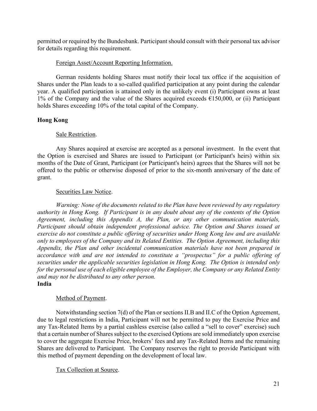 21 permitted or required by the Bundesbank. Participant should consult with their personal tax advisor for details regarding this requirement. Foreign Asset/Account Reporting Information. German residents holding Shares must notify their local tax office if the acquisition of Shares under the Plan leads to a so-called qualified participation at any point during the calendar year. A qualified participation is attained only in the unlikely event (i) Participant owns at least 1% of the Company and the value of the Shares acquired exceeds €150,000, or (ii) Participant holds Shares exceeding 10% of the total capital of the Company. Hong Kong Sale Restriction. Any Shares acquired at exercise are accepted as a personal investment. In the event that the Option is exercised and Shares are issued to Participant (or Participant's heirs) within six months of the Date of Grant, Participant (or Participant's heirs) agrees that the Shares will not be offered to the public or otherwise disposed of prior to the six-month anniversary of the date of grant. Securities Law Notice. Warning: None of the documents related to the Plan have been reviewed by any regulatory authority in Hong Kong. If Participant is in any doubt about any of the contents of the Option Agreement, including this Appendix A, the Plan, or any other communication materials, Participant should obtain independent professional advice. The Option and Shares issued at exercise do not constitute a public offering of securities under Hong Kong law and are available only to employees of the Company and its Related Entities. The Option Agreement, including this Appendix, the Plan and other incidental communication materials have not been prepared in accordance with and are not intended to constitute a “prospectus” for a public offering of securities under the applicable securities legislation in Hong Kong. The Option is intended only for the personal use of each eligible employee of the Employer, the Company or any Related Entity and may not be distributed to any other person. India Method of Payment. Notwithstanding section 7(d) of the Plan or sections II.B and II.C of the Option Agreement, due to legal restrictions in India, Participant will not be permitted to pay the Exercise Price and any Tax-Related Items by a partial cashless exercise (also called a “sell to cover” exercise) such that a certain number of Shares subject to the exercised Options are sold immediately upon exercise to cover the aggregate Exercise Price, brokers’ fees and any Tax-Related Items and the remaining Shares are delivered to Participant. The Company reserves the right to provide Participant with this method of payment depending on the development of local law. Tax Collection at Source.