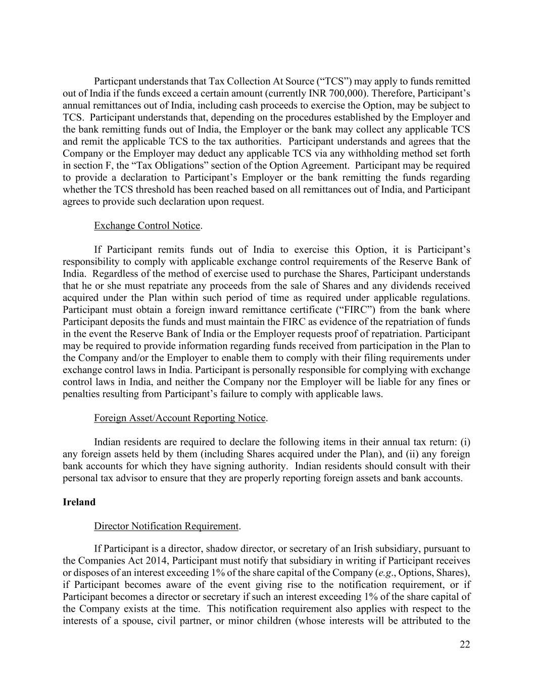 22 Particpant understands that Tax Collection At Source (“TCS”) may apply to funds remitted out of India if the funds exceed a certain amount (currently INR 700,000). Therefore, Participant’s annual remittances out of India, including cash proceeds to exercise the Option, may be subject to TCS. Participant understands that, depending on the procedures established by the Employer and the bank remitting funds out of India, the Employer or the bank may collect any applicable TCS and remit the applicable TCS to the tax authorities. Participant understands and agrees that the Company or the Employer may deduct any applicable TCS via any withholding method set forth in section F, the “Tax Obligations” section of the Option Agreement. Participant may be required to provide a declaration to Participant’s Employer or the bank remitting the funds regarding whether the TCS threshold has been reached based on all remittances out of India, and Participant agrees to provide such declaration upon request. Exchange Control Notice. If Participant remits funds out of India to exercise this Option, it is Participant’s responsibility to comply with applicable exchange control requirements of the Reserve Bank of India. Regardless of the method of exercise used to purchase the Shares, Participant understands that he or she must repatriate any proceeds from the sale of Shares and any dividends received acquired under the Plan within such period of time as required under applicable regulations. Participant must obtain a foreign inward remittance certificate (“FIRC”) from the bank where Participant deposits the funds and must maintain the FIRC as evidence of the repatriation of funds in the event the Reserve Bank of India or the Employer requests proof of repatriation. Participant may be required to provide information regarding funds received from participation in the Plan to the Company and/or the Employer to enable them to comply with their filing requirements under exchange control laws in India. Participant is personally responsible for complying with exchange control laws in India, and neither the Company nor the Employer will be liable for any fines or penalties resulting from Participant’s failure to comply with applicable laws. Foreign Asset/Account Reporting Notice. Indian residents are required to declare the following items in their annual tax return: (i) any foreign assets held by them (including Shares acquired under the Plan), and (ii) any foreign bank accounts for which they have signing authority. Indian residents should consult with their personal tax advisor to ensure that they are properly reporting foreign assets and bank accounts. Ireland Director Notification Requirement. If Participant is a director, shadow director, or secretary of an Irish subsidiary, pursuant to the Companies Act 2014, Participant must notify that subsidiary in writing if Participant receives or disposes of an interest exceeding 1% of the share capital of the Company (e.g., Options, Shares), if Participant becomes aware of the event giving rise to the notification requirement, or if Participant becomes a director or secretary if such an interest exceeding 1% of the share capital of the Company exists at the time. This notification requirement also applies with respect to the interests of a spouse, civil partner, or minor children (whose interests will be attributed to the