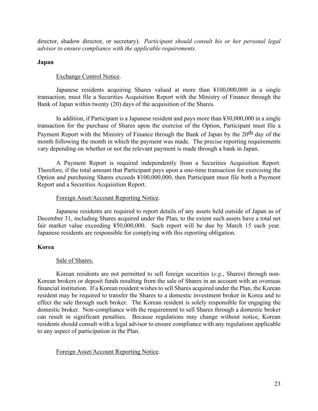 23 director, shadow director, or secretary). Participant should consult his or her personal legal advisor to ensure compliance with the applicable requirements. Japan Exchange Control Notice. Japanese residents acquiring Shares valued at more than ¥100,000,000 in a single transaction, must file a Securities Acquisition Report with the Ministry of Finance through the Bank of Japan within twenty (20) days of the acquisition of the Shares. In addition, if Participant is a Japanese resident and pays more than ¥30,000,000 in a single transaction for the purchase of Shares upon the exercise of the Option, Participant must file a Payment Report with the Ministry of Finance through the Bank of Japan by the 20th day of the month following the month in which the payment was made. The precise reporting requirements vary depending on whether or not the relevant payment is made through a bank in Japan. A Payment Report is required independently from a Securities Acquisition Report. Therefore, if the total amount that Participant pays upon a one-time transaction for exercising the Option and purchasing Shares exceeds ¥100,000,000, then Participant must file both a Payment Report and a Securities Acquisition Report. Foreign Asset/Account Reporting Notice. Japanese residents are required to report details of any assets held outside of Japan as of December 31, including Shares acquired under the Plan, to the extent such assets have a total net fair market value exceeding ¥50,000,000. Such report will be due by March 15 each year. Japanese residents are responsible for complying with this reporting obligation. Korea Sale of Shares. Korean residents are not permitted to sell foreign securities (e.g., Shares) through non- Korean brokers or deposit funds resulting from the sale of Shares in an account with an overseas financial institution. If a Korean resident wishes to sell Shares acquired under the Plan, the Korean resident may be required to transfer the Shares to a domestic investment broker in Korea and to effect the sale through such broker. The Korean resident is solely responsible for engaging the domestic broker. Non-compliance with the requirement to sell Shares through a domestic broker can result in significant penalties. Because regulations may change without notice, Korean residents should consult with a legal advisor to ensure compliance with any regulations applicable to any aspect of participation in the Plan. Foreign Asset/Account Reporting Notice.