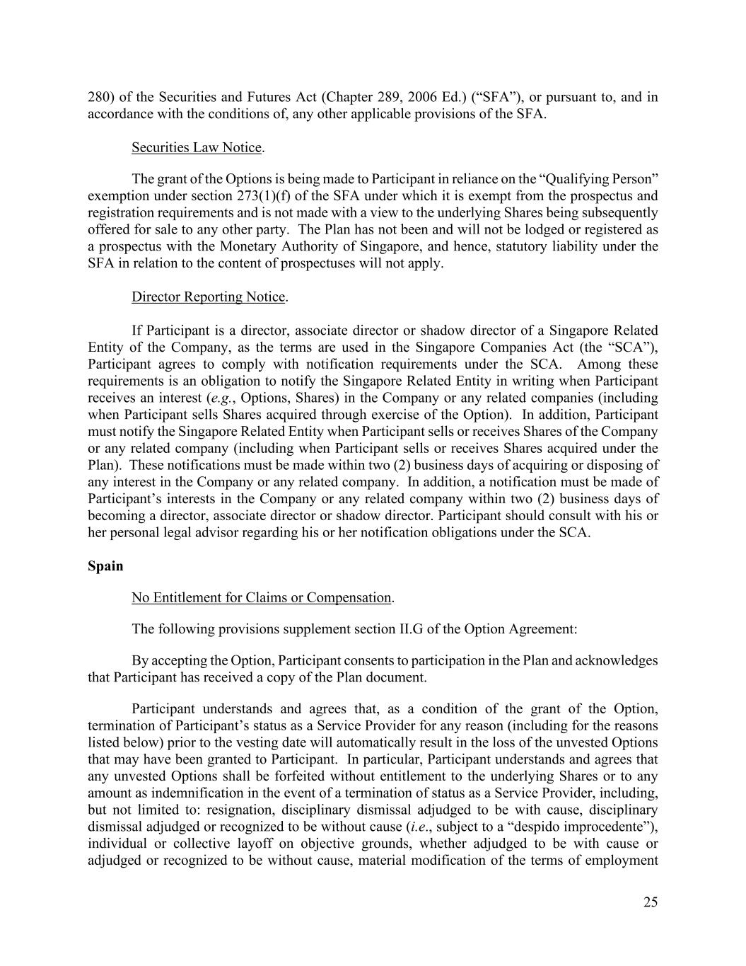 25 280) of the Securities and Futures Act (Chapter 289, 2006 Ed.) (“SFA”), or pursuant to, and in accordance with the conditions of, any other applicable provisions of the SFA. Securities Law Notice. The grant of the Options is being made to Participant in reliance on the “Qualifying Person” exemption under section 273(1)(f) of the SFA under which it is exempt from the prospectus and registration requirements and is not made with a view to the underlying Shares being subsequently offered for sale to any other party. The Plan has not been and will not be lodged or registered as a prospectus with the Monetary Authority of Singapore, and hence, statutory liability under the SFA in relation to the content of prospectuses will not apply. Director Reporting Notice. If Participant is a director, associate director or shadow director of a Singapore Related Entity of the Company, as the terms are used in the Singapore Companies Act (the “SCA”), Participant agrees to comply with notification requirements under the SCA. Among these requirements is an obligation to notify the Singapore Related Entity in writing when Participant receives an interest (e.g., Options, Shares) in the Company or any related companies (including when Participant sells Shares acquired through exercise of the Option). In addition, Participant must notify the Singapore Related Entity when Participant sells or receives Shares of the Company or any related company (including when Participant sells or receives Shares acquired under the Plan). These notifications must be made within two (2) business days of acquiring or disposing of any interest in the Company or any related company. In addition, a notification must be made of Participant’s interests in the Company or any related company within two (2) business days of becoming a director, associate director or shadow director. Participant should consult with his or her personal legal advisor regarding his or her notification obligations under the SCA. Spain No Entitlement for Claims or Compensation. The following provisions supplement section II.G of the Option Agreement: By accepting the Option, Participant consents to participation in the Plan and acknowledges that Participant has received a copy of the Plan document. Participant understands and agrees that, as a condition of the grant of the Option, termination of Participant’s status as a Service Provider for any reason (including for the reasons listed below) prior to the vesting date will automatically result in the loss of the unvested Options that may have been granted to Participant. In particular, Participant understands and agrees that any unvested Options shall be forfeited without entitlement to the underlying Shares or to any amount as indemnification in the event of a termination of status as a Service Provider, including, but not limited to: resignation, disciplinary dismissal adjudged to be with cause, disciplinary dismissal adjudged or recognized to be without cause (i.e., subject to a “despido improcedente”), individual or collective layoff on objective grounds, whether adjudged to be with cause or adjudged or recognized to be without cause, material modification of the terms of employment