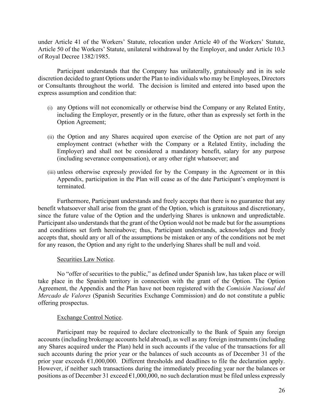 26 under Article 41 of the Workers’ Statute, relocation under Article 40 of the Workers’ Statute, Article 50 of the Workers’ Statute, unilateral withdrawal by the Employer, and under Article 10.3 of Royal Decree 1382/1985. Participant understands that the Company has unilaterally, gratuitously and in its sole discretion decided to grant Options under the Plan to individuals who may be Employees, Directors or Consultants throughout the world. The decision is limited and entered into based upon the express assumption and condition that: (i) any Options will not economically or otherwise bind the Company or any Related Entity, including the Employer, presently or in the future, other than as expressly set forth in the Option Agreement; (ii) the Option and any Shares acquired upon exercise of the Option are not part of any employment contract (whether with the Company or a Related Entity, including the Employer) and shall not be considered a mandatory benefit, salary for any purpose (including severance compensation), or any other right whatsoever; and (iii) unless otherwise expressly provided for by the Company in the Agreement or in this Appendix, participation in the Plan will cease as of the date Participant’s employment is terminated. Furthermore, Participant understands and freely accepts that there is no guarantee that any benefit whatsoever shall arise from the grant of the Option, which is gratuitous and discretionary, since the future value of the Option and the underlying Shares is unknown and unpredictable. Participant also understands that the grant of the Option would not be made but for the assumptions and conditions set forth hereinabove; thus, Participant understands, acknowledges and freely accepts that, should any or all of the assumptions be mistaken or any of the conditions not be met for any reason, the Option and any right to the underlying Shares shall be null and void. Securities Law Notice. No “offer of securities to the public,” as defined under Spanish law, has taken place or will take place in the Spanish territory in connection with the grant of the Option. The Option Agreement, the Appendix and the Plan have not been registered with the Comisión Nacional del Mercado de Valores (Spanish Securities Exchange Commission) and do not constitute a public offering prospectus. Exchange Control Notice. Participant may be required to declare electronically to the Bank of Spain any foreign accounts (including brokerage accounts held abroad), as well as any foreign instruments (including any Shares acquired under the Plan) held in such accounts if the value of the transactions for all such accounts during the prior year or the balances of such accounts as of December 31 of the prior year exceeds €1,000,000. Different thresholds and deadlines to file the declaration apply. However, if neither such transactions during the immediately preceding year nor the balances or positions as of December 31 exceed €1,000,000, no such declaration must be filed unless expressly