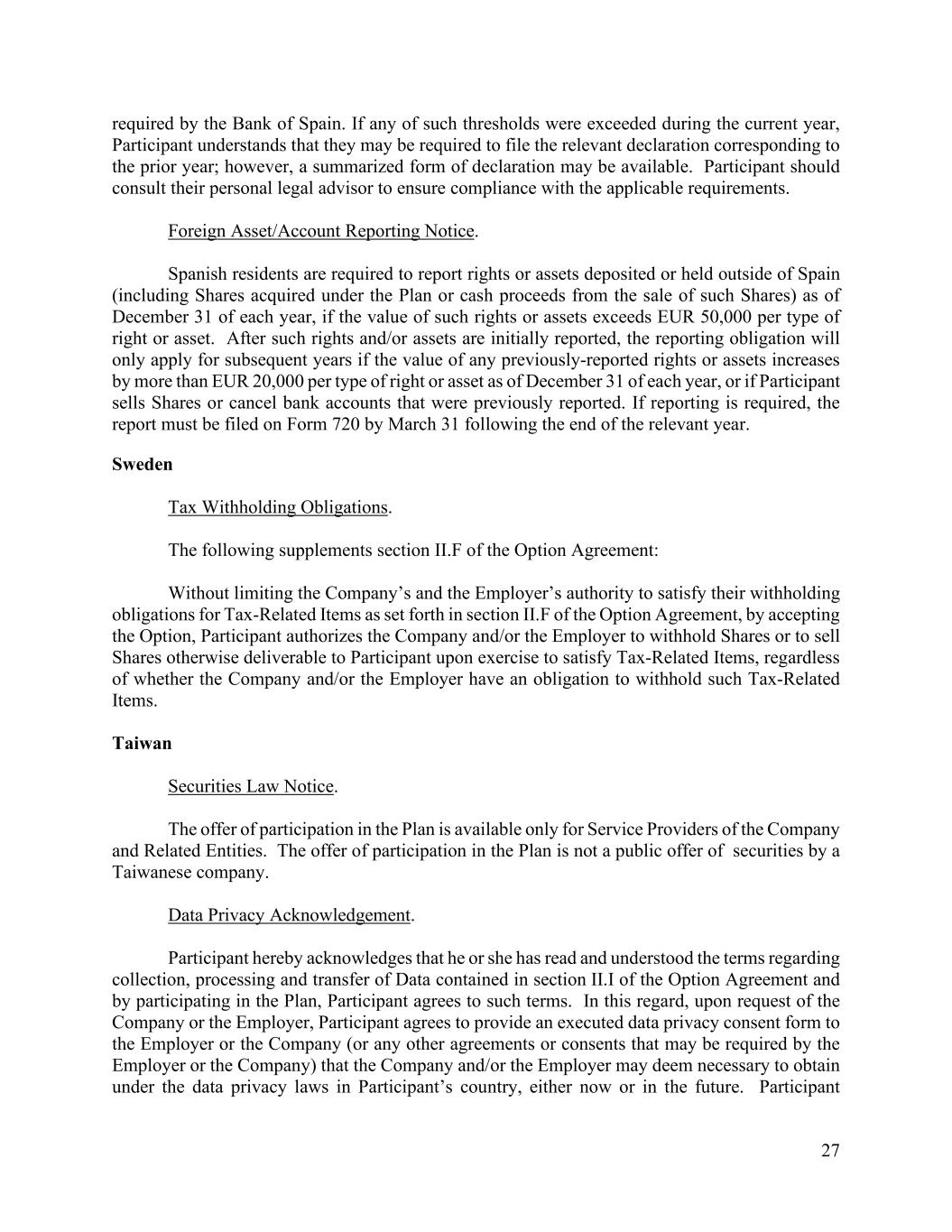 27 required by the Bank of Spain. If any of such thresholds were exceeded during the current year, Participant understands that they may be required to file the relevant declaration corresponding to the prior year; however, a summarized form of declaration may be available. Participant should consult their personal legal advisor to ensure compliance with the applicable requirements. Foreign Asset/Account Reporting Notice. Spanish residents are required to report rights or assets deposited or held outside of Spain (including Shares acquired under the Plan or cash proceeds from the sale of such Shares) as of December 31 of each year, if the value of such rights or assets exceeds EUR 50,000 per type of right or asset. After such rights and/or assets are initially reported, the reporting obligation will only apply for subsequent years if the value of any previously-reported rights or assets increases by more than EUR 20,000 per type of right or asset as of December 31 of each year, or if Participant sells Shares or cancel bank accounts that were previously reported. If reporting is required, the report must be filed on Form 720 by March 31 following the end of the relevant year. Sweden Tax Withholding Obligations. The following supplements section II.F of the Option Agreement: Without limiting the Company’s and the Employer’s authority to satisfy their withholding obligations for Tax-Related Items as set forth in section II.F of the Option Agreement, by accepting the Option, Participant authorizes the Company and/or the Employer to withhold Shares or to sell Shares otherwise deliverable to Participant upon exercise to satisfy Tax-Related Items, regardless of whether the Company and/or the Employer have an obligation to withhold such Tax-Related Items. Taiwan Securities Law Notice. The offer of participation in the Plan is available only for Service Providers of the Company and Related Entities. The offer of participation in the Plan is not a public offer of securities by a Taiwanese company. Data Privacy Acknowledgement. Participant hereby acknowledges that he or she has read and understood the terms regarding collection, processing and transfer of Data contained in section II.I of the Option Agreement and by participating in the Plan, Participant agrees to such terms. In this regard, upon request of the Company or the Employer, Participant agrees to provide an executed data privacy consent form to the Employer or the Company (or any other agreements or consents that may be required by the Employer or the Company) that the Company and/or the Employer may deem necessary to obtain under the data privacy laws in Participant’s country, either now or in the future. Participant