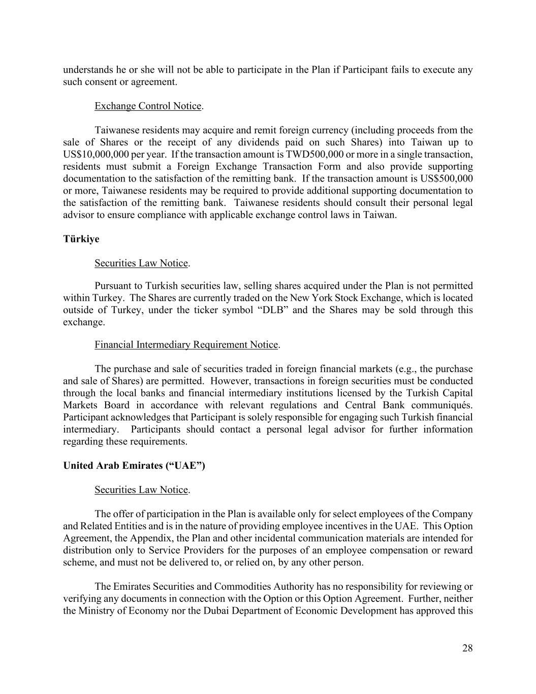 28 understands he or she will not be able to participate in the Plan if Participant fails to execute any such consent or agreement. Exchange Control Notice. Taiwanese residents may acquire and remit foreign currency (including proceeds from the sale of Shares or the receipt of any dividends paid on such Shares) into Taiwan up to US$10,000,000 per year. If the transaction amount is TWD500,000 or more in a single transaction, residents must submit a Foreign Exchange Transaction Form and also provide supporting documentation to the satisfaction of the remitting bank. If the transaction amount is US$500,000 or more, Taiwanese residents may be required to provide additional supporting documentation to the satisfaction of the remitting bank. Taiwanese residents should consult their personal legal advisor to ensure compliance with applicable exchange control laws in Taiwan. Türkiye Securities Law Notice. Pursuant to Turkish securities law, selling shares acquired under the Plan is not permitted within Turkey. The Shares are currently traded on the New York Stock Exchange, which is located outside of Turkey, under the ticker symbol “DLB” and the Shares may be sold through this exchange. Financial Intermediary Requirement Notice. The purchase and sale of securities traded in foreign financial markets (e.g., the purchase and sale of Shares) are permitted. However, transactions in foreign securities must be conducted through the local banks and financial intermediary institutions licensed by the Turkish Capital Markets Board in accordance with relevant regulations and Central Bank communiqués. Participant acknowledges that Participant is solely responsible for engaging such Turkish financial intermediary. Participants should contact a personal legal advisor for further information regarding these requirements. United Arab Emirates (“UAE”) Securities Law Notice. The offer of participation in the Plan is available only for select employees of the Company and Related Entities and is in the nature of providing employee incentives in the UAE. This Option Agreement, the Appendix, the Plan and other incidental communication materials are intended for distribution only to Service Providers for the purposes of an employee compensation or reward scheme, and must not be delivered to, or relied on, by any other person. The Emirates Securities and Commodities Authority has no responsibility for reviewing or verifying any documents in connection with the Option or this Option Agreement. Further, neither the Ministry of Economy nor the Dubai Department of Economic Development has approved this