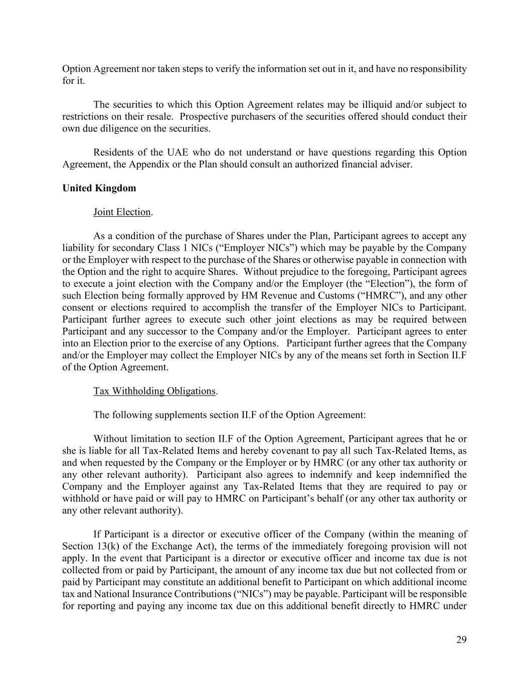 29 Option Agreement nor taken steps to verify the information set out in it, and have no responsibility for it. The securities to which this Option Agreement relates may be illiquid and/or subject to restrictions on their resale. Prospective purchasers of the securities offered should conduct their own due diligence on the securities. Residents of the UAE who do not understand or have questions regarding this Option Agreement, the Appendix or the Plan should consult an authorized financial adviser. United Kingdom Joint Election. As a condition of the purchase of Shares under the Plan, Participant agrees to accept any liability for secondary Class 1 NICs (“Employer NICs”) which may be payable by the Company or the Employer with respect to the purchase of the Shares or otherwise payable in connection with the Option and the right to acquire Shares. Without prejudice to the foregoing, Participant agrees to execute a joint election with the Company and/or the Employer (the “Election”), the form of such Election being formally approved by HM Revenue and Customs (“HMRC”), and any other consent or elections required to accomplish the transfer of the Employer NICs to Participant. Participant further agrees to execute such other joint elections as may be required between Participant and any successor to the Company and/or the Employer. Participant agrees to enter into an Election prior to the exercise of any Options. Participant further agrees that the Company and/or the Employer may collect the Employer NICs by any of the means set forth in Section II.F of the Option Agreement. Tax Withholding Obligations. The following supplements section II.F of the Option Agreement: Without limitation to section II.F of the Option Agreement, Participant agrees that he or she is liable for all Tax-Related Items and hereby covenant to pay all such Tax-Related Items, as and when requested by the Company or the Employer or by HMRC (or any other tax authority or any other relevant authority). Participant also agrees to indemnify and keep indemnified the Company and the Employer against any Tax-Related Items that they are required to pay or withhold or have paid or will pay to HMRC on Participant’s behalf (or any other tax authority or any other relevant authority). If Participant is a director or executive officer of the Company (within the meaning of Section 13(k) of the Exchange Act), the terms of the immediately foregoing provision will not apply. In the event that Participant is a director or executive officer and income tax due is not collected from or paid by Participant, the amount of any income tax due but not collected from or paid by Participant may constitute an additional benefit to Participant on which additional income tax and National Insurance Contributions (“NICs”) may be payable. Participant will be responsible for reporting and paying any income tax due on this additional benefit directly to HMRC under