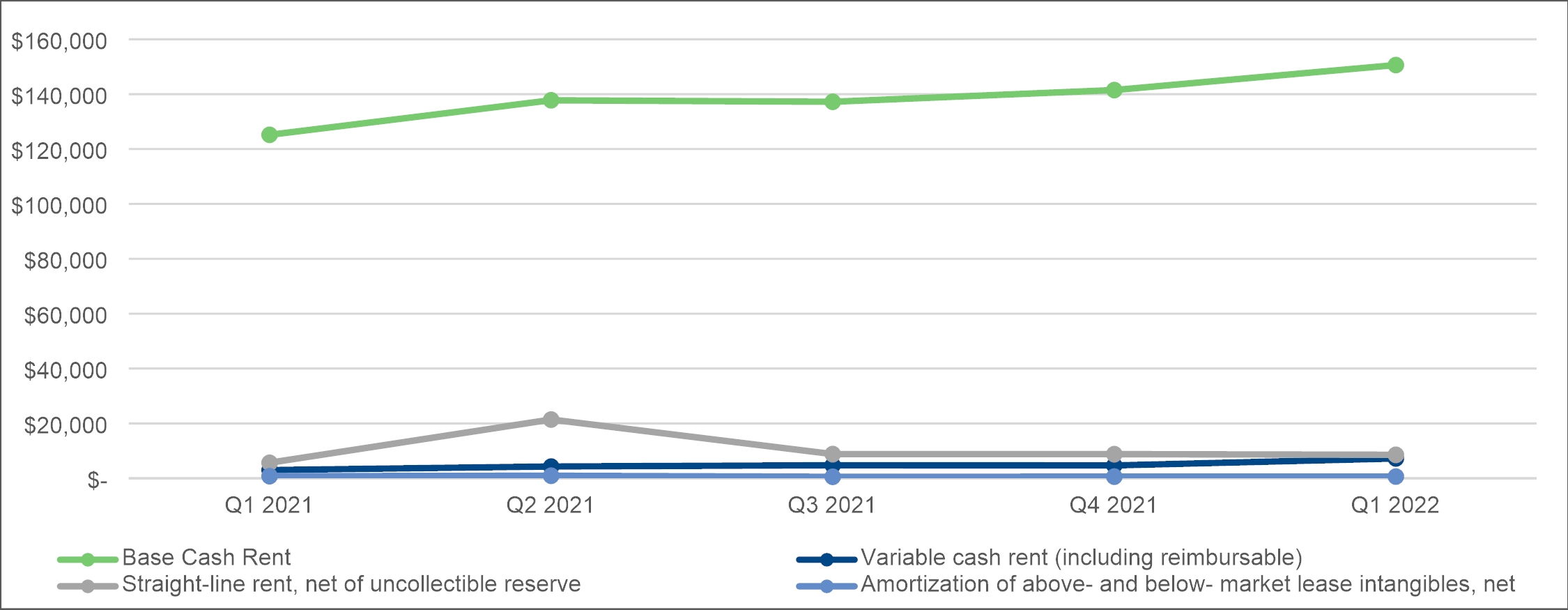 Adjustments for the three months ended March 31, 2022 relates to net current period recoveries related to prior period rent deemed not probable of collection and prior period property costs. For the same period in 2021, adjustments are comprised of previously deferred revenue recognized in the current period, net recoveries related to prior period rent deemed not probable of collection and property costs. |