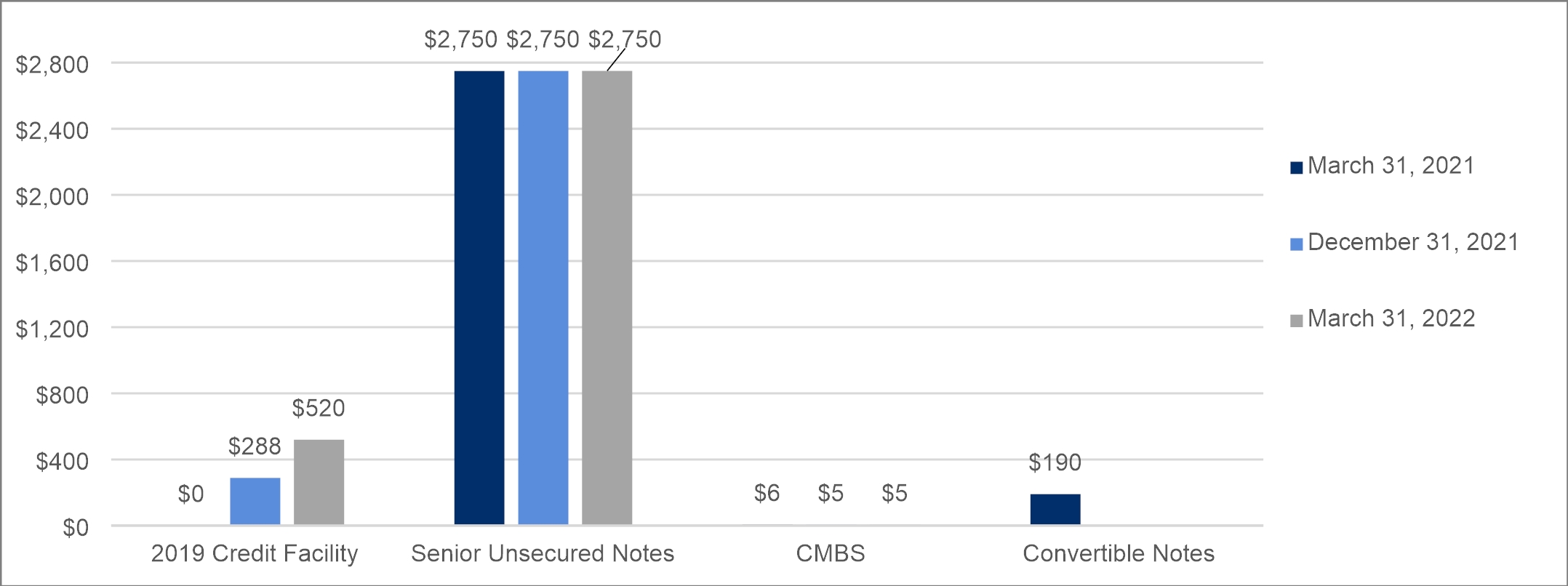 The estimated fair values of our Senior Unsecured Notes have been derived based on quoted prices in active markets, while the estimated fair values of the remaining debt instruments have been derived based on discounted cash flow analysis using estimates of the amount and timing of future cash flows, market rates and credit spreads. The debt instrument balances as of March 31, 2022 are as follows (in thousands):