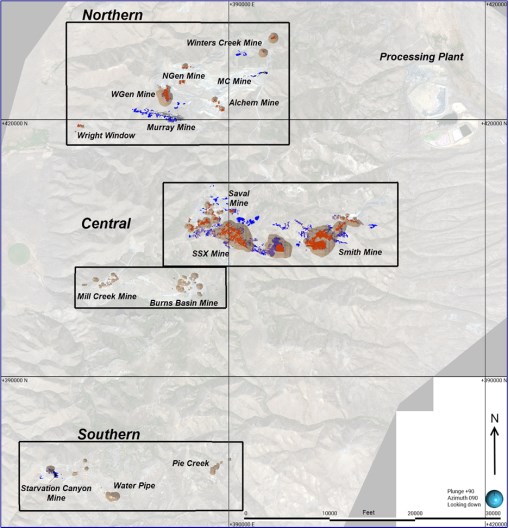 Figure 1: Location of the Jerritt Canyon Mines and Gold Mineral Deposits, Underground and Open Pit Mineral Resource Estimates, Plan View