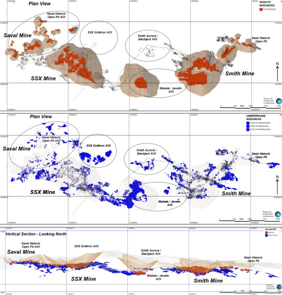 Figure 2: Plan View and Vertical Section of 2025 Year-End Underground and Open Pit Resources in the Saval / SSX / Mahala / Javelin / Smith Mine Zones with Areas of Interest ("AOI") for Targeted Exploration Drilling