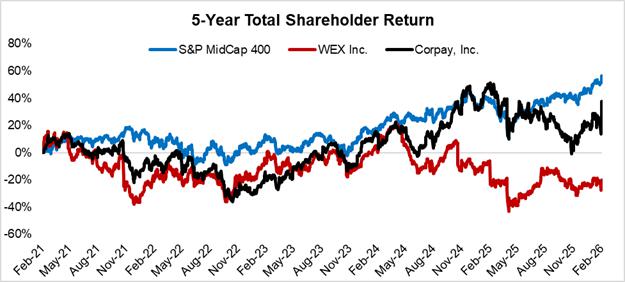 “As one of WEX’s largest and most committed investors, Impactive is fully aligned with the success of the Company. This is why for the past four years we have repeatedly sought to engage constructively with the Board to help close the gap between WEX’s intrinsic value and its stock price. Despite our best efforts, the Board has continued to dismiss our view that WEX’s long-term owners deserve meaningful representation in the boardroom to hold management accountable and drive improved operating performance. Without oversight by shareholders, the outcomes have been both predictable and deeply disappointing, and the widening gap versus its closest peer, Corpay, Inc. (NYSE: CPAY), is increasingly alarming. Over the last five years, WEX has trailed Corpay by 58% and underperformed the S&P MidCap 400 by 76%.1 More recently, over the past three years, it has underperformed Corpay by 81% and the S&P MidCap 400 by 52%.