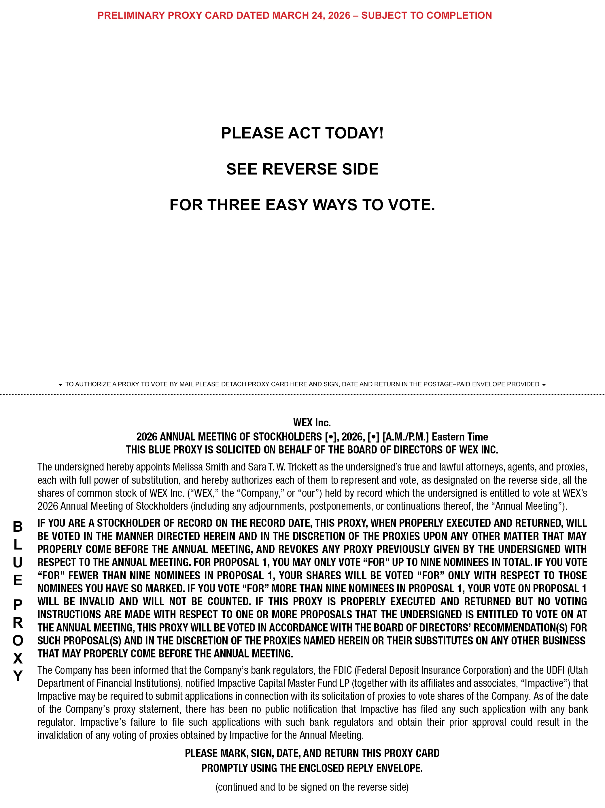 PRELIMINARY PROXY CARD DATED MARCH 24, 2026 – SUBJECT TO COMPLETION PLEASE ACT TODAY! SEE REVERSE SIDE FOR THREE EASY WAYS TO VOTE. TO AUTHORIZE A PROXY TO VOTE BY MAIL PLEASE DETACH PROXY CARD HERE AND SIGN, DATE AND RETURN IN THE POSTAGE–PAID ENVELOPE PROVIDED WEX Inc. 2026 ANNUAL MEETING OF STOCKHOLDERS [•], 2026, [•] [A.M./P.M.] Eastern Time THIS BLUE PROXY IS SOLICITED ON BEHALF OF THE BOARD OF DIRECTORS OF WEX INC. The undersigned hereby appoints Melissa Smith and Sara T. W. Trickett as the undersigned’s true and lawful attorneys, agents, and proxies, each with full power of substitution, and hereby authorizes each of them to represent and vote, as designated on the reverse side, all the shares of common stock of WEX Inc. (“WEX,” the “Company,” or “our”) held by record which the undersigned is entitled to vote at WEX’s 2026 Annual Meeting of Stockholders (including any adjournments, postponements, or continuations thereof, the “Annual Meeting”). IF YOU ARE A STOCKHOLDER OF RECORD ON THE RECORD DATE, THIS PROXY, WHEN PROPERLY EXECUTED AND RETURNED, WILL BE VOTED IN THE MANNER DIRECTED HEREIN AND IN THE DISCRETION OF THE PROXIES UPON ANY OTHER MATTER THAT MAY PROPERLY COME BEFORE THE ANNUAL MEETING, AND REVOKES ANY PROXY PREVIOUSLY GIVEN BY THE UNDERSIGNED WITH RESPECT TO THE ANNUAL MEETING. FOR PROPOSAL 1, YOU MAY ONLY VOTE “FOR” UP TO NINE NOMINEES IN TOTAL. IF YOU VOTE “FOR” FEWER THAN NINE NOMINEES IN PROPOSAL 1, YOUR SHARES WILL BE VOTED “FOR” ONLY WITH RESPECT TO THOSE NOMINEES YOU HAVE SO MARKED. IF YOU VOTE “FOR” MORE THAN NINE NOMINEES IN PROPOSAL 1, YOUR VOTE ON PROPOSAL 1 WILL BE INVALID AND WILL NOT BE COUNTED. IF THIS PROXY IS PROPERLY EXECUTED AND RETURNED BUT NO VOTING INSTRUCTIONS ARE MADE WITH RESPECT TO ONE OR MORE PROPOSALS THAT THE UNDERSIGNED IS ENTITLED TO VOTE ON AT THE ANNUAL MEETING, THIS PROXY WILL BE VOTED IN ACCORDANCE WITH THE BOARD OF DIRECTORS’ RECOMMENDATION(S) FOR SUCH PROPOSAL(S) AND IN THE DISCRETION OF THE PROXIES NAMED HEREIN OR THEIR SUBSTITUTES ON ANY OTHER BUSINESS THAT MAY PROPERLY COME BEFORE THE ANNUAL MEETING. The Company has been informed that the Company’s bank regulators, the FDIC (Federal Deposit Insurance Corporation) and the UDFI (Utah Department of Financial Institutions), notified Impactive Capital Master Fund LP (together with its affiliates and associates, “Impactive”) that Impactive may be required to submit applications in connection with its solicitation of proxies to vote shares of the Company. As of the date of the Company’s proxy statement, there has been no public notification that Impactive has filed any such application with any bank regulator. Impactive’s failure to file such applications with such bank regulators and obtain their prior approval could result in the invalidation of any voting of proxies obtained by Impactive for the Annual Meeting. PLEASE MARK, SIGN, DATE, AND RETURN THIS PROXY CARD PROMPTLY USING THE ENCLOSED REPLY ENVELOPE. (continued and to be signed on the reverse side) BLUE PROXY
