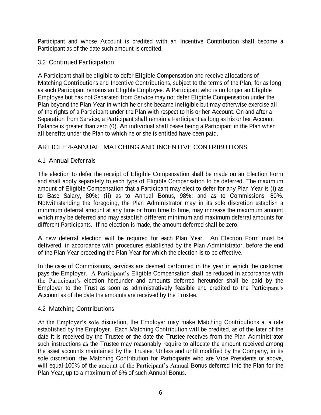 6 Participant and whose Account is credited with an Incentive Contribution shall become a Participant as of the date such amount is credited. 3.2 Continued Participation A Participant shall be eligible to defer Eligible Compensation and receive allocations of Matching Contributions and Incentive Contributions, subject to the terms of the Plan, for as long as such Participant remains an Eligible Employee. A Participant who is no longer an Eligible Employee but has not Separated from Service may not defer Eligible Compensation under the Plan beyond the Plan Year in which he or she became ineligible but may otherwise exercise all of the rights of a Participant under the Plan with respect to his or her Account. On and after a Separation from Service, a Participant shall remain a Participant as long as his or her Account Balance is greater than zero (0). An individual shall cease being a Participant in the Plan when all benefits under the Plan to which he or she is entitled have been paid. ARTICLE 4-ANNUAL, MATCHING AND INCENTIVE CONTRIBUTIONS 4.1 Annual Deferrals The election to defer the receipt of Eligible Compensation shall be made on an Election Form and shall apply separately to each type of Eligible Compensation to be deferred. The maximum amount of Eligible Compensation that a Participant may elect to defer for any Plan Year is (i) as to Base Salary, 80%; (ii) as to Annual Bonus, 98%; and as to Commissions, 80%. Notwithstanding the foregoing, the Plan Administrator may in its sole discretion establish a minimum deferral amount at any time or from time to time, may increase the maximum amount which may be deferred and may establish different minimum and maximum deferral amounts for different Participants. If no election is made, the amount deferred shall be zero. A new deferral election will be required for each Plan Year. An Election Form must be delivered, in accordance with procedures established by the Plan Administrator, before the end of the Plan Year preceding the Plan Year for which the election is to be effective. In the case of Commissions, services are deemed performed in the year in which the customer pays the Employer. A Participant’s Eligible Compensation shall be reduced in accordance with the Participant’s election hereunder and amounts deferred hereunder shall be paid by the Employer to the Trust as soon as administratively feasible and credited to the Participant’s Account as of the date the amounts are received by the Trustee. 4.2 Matching Contributions At the Employer’s sole discretion, the Employer may make Matching Contributions at a rate established by the Employer. Each Matching Contribution will be credited, as of the later of the date it is received by the Trustee or the date the Trustee receives from the Plan Administrator such instructions as the Trustee may reasonably require to allocate the amount received among the asset accounts maintained by the Trustee. Unless and until modified by the Company, in its sole discretion, the Matching Contribution for Participants who are Vice Presidents or above, will equal 100% of the amount of the Participant’s Annual Bonus deferred into the Plan for the Plan Year, up to a maximum of 6% of such Annual Bonus.