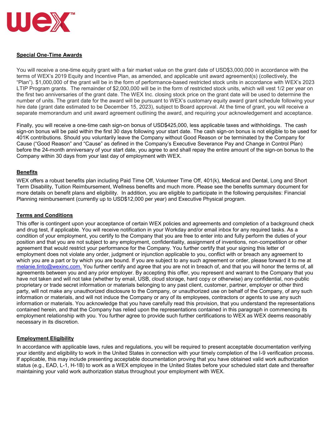 Special One-Time Awards You will receive a one-time equity grant with a fair market value on the grant date of USD$3,000,000 in accordance with the terms of WEX’s 2019 Equity and Incentive Plan, as amended, and applicable unit award agreement(s) (collectively, the “Plan”). $1,000,000 of the grant will be in the form of performance-based restricted stock units in accordance with WEX’s 2023 LTIP Program grants. The remainder of $2,000,000 will be in the form of restricted stock units, which will vest 1/2 per year on the first two anniversaries of the grant date. The WEX Inc. closing stock price on the grant date will be used to determine the number of units. The grant date for the award will be pursuant to WEX’s customary equity award grant schedule following your hire date (grant date estimated to be December 15, 2023), subject to Board approval. At the time of grant, you will receive a separate memorandum and unit award agreement outlining the award, and requiring your acknowledgement and acceptance. Finally, you will receive a one-time cash sign-on bonus of USD$425,000, less applicable taxes and withholdings. The cash sign-on bonus will be paid within the first 30 days following your start date. The cash sign-on bonus is not eligible to be used for 401K contributions. Should you voluntarily leave the Company without Good Reason or be terminated by the Company for Cause (“Good Reason” and “Cause” as defined in the Company’s Executive Severance Pay and Change in Control Plan) before the 24-month anniversary of your start date, you agree to and shall repay the entire amount of the sign-on bonus to the Company within 30 days from your last day of employment with WEX. Benefits WEX offers a robust benefits plan including Paid Time Off, Volunteer Time Off, 401(k), Medical and Dental, Long and Short Term Disability, Tuition Reimbursement, Wellness benefits and much more. Please see the benefits summary document for more details on benefit plans and eligibility. In addition, you are eligible to participate in the following perquisites: Financial Planning reimbursement (currently up to USD$12,000 per year) and Executive Physical program. Terms and Conditions This offer is contingent upon your acceptance of certain WEX policies and agreements and completion of a background check and drug test, if applicable. You will receive notification in your Workday and/or email inbox for any required tasks. As a condition of your employment, you certify to the Company that you are free to enter into and fully perform the duties of your position and that you are not subject to any employment, confidentiality, assignment of inventions, non-competition or other agreement that would restrict your performance for the Company. You further certify that your signing this letter of employment does not violate any order, judgment or injunction applicable to you, conflict with or breach any agreement to which you are a part or by which you are bound. If you are subject to any such agreement or order, please forward it to me at melanie.tinto@wexinc.com. You further certify and agree that you are not in breach of, and that you will honor the terms of, all agreements between you and any prior employer. By accepting this offer, you represent and warrant to the Company that you have not taken and will not take (whether by email, USB, cloud storage, hard copy or otherwise) any confidential, non-public proprietary or trade secret information or materials belonging to any past client, customer, partner, employer or other third party, will not make any unauthorized disclosure to the Company, or unauthorized use on behalf of the Company, of any such information or materials, and will not induce the Company or any of its employees, contractors or agents to use any such information or materials. You acknowledge that you have carefully read this provision, that you understand the representations contained herein, and that the Company has relied upon the representations contained in this paragraph in commencing its employment relationship with you. You further agree to provide such further certifications to WEX as WEX deems reasonably necessary in its discretion. Employment Eligibility In accordance with applicable laws, rules and regulations, you will be required to present acceptable documentation verifying your identity and eligibility to work in the United States in connection with your timely completion of the I-9 verification process. If applicable, this may include presenting acceptable documentation proving that you have obtained valid work authorization status (e.g., EAD, L-1, H-1B) to work as a WEX employee in the United States before your scheduled start date and thereafter maintaining your valid work authorization status throughout your employment with WEX.