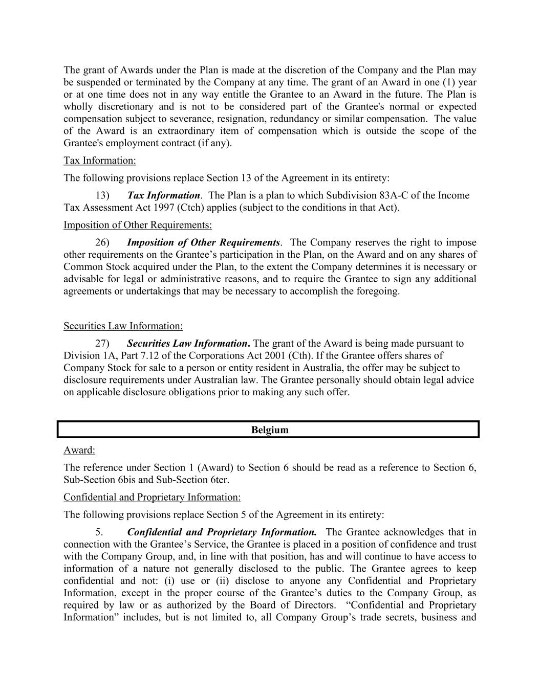 The grant of Awards under the Plan is made at the discretion of the Company and the Plan may be suspended or terminated by the Company at any time. The grant of an Award in one (1) year or at one time does not in any way entitle the Grantee to an Award in the future. The Plan is wholly discretionary and is not to be considered part of the Grantee's normal or expected compensation subject to severance, resignation, redundancy or similar compensation. The value of the Award is an extraordinary item of compensation which is outside the scope of the Grantee's employment contract (if any). Tax Information: The following provisions replace Section 13 of the Agreement in its entirety: 13) Tax Information. The Plan is a plan to which Subdivision 83A-C of the Income Tax Assessment Act 1997 (Ctch) applies (subject to the conditions in that Act). Imposition of Other Requirements: 26) Imposition of Other Requirements. The Company reserves the right to impose other requirements on the Grantee’s participation in the Plan, on the Award and on any shares of Common Stock acquired under the Plan, to the extent the Company determines it is necessary or advisable for legal or administrative reasons, and to require the Grantee to sign any additional agreements or undertakings that may be necessary to accomplish the foregoing. Securities Law Information: 27) Securities Law Information. The grant of the Award is being made pursuant to Division 1A, Part 7.12 of the Corporations Act 2001 (Cth). If the Grantee offers shares of Company Stock for sale to a person or entity resident in Australia, the offer may be subject to disclosure requirements under Australian law. The Grantee personally should obtain legal advice on applicable disclosure obligations prior to making any such offer. Belgium Award: The reference under Section 1 (Award) to Section 6 should be read as a reference to Section 6, Sub-Section 6bis and Sub-Section 6ter. Confidential and Proprietary Information: The following provisions replace Section 5 of the Agreement in its entirety: 5. Confidential and Proprietary Information. The Grantee acknowledges that in connection with the Grantee’s Service, the Grantee is placed in a position of confidence and trust with the Company Group, and, in line with that position, has and will continue to have access to information of a nature not generally disclosed to the public. The Grantee agrees to keep confidential and not: (i) use or (ii) disclose to anyone any Confidential and Proprietary Information, except in the proper course of the Grantee’s duties to the Company Group, as required by law or as authorized by the Board of Directors. “Confidential and Proprietary Information” includes, but is not limited to, all Company Group’s trade secrets, business and