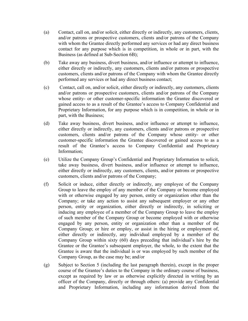 (a) Contact, call on, and/or solicit, either directly or indirectly, any customers, clients, and/or patrons or prospective customers, clients and/or patrons of the Company with whom the Grantee directly performed any services or had any direct business contact for any purpose which is in competition, in whole or in part, with the Business (as defined at Sub-Section 6B); (b) Take away any business, divert business, and/or influence or attempt to influence, either directly or indirectly, any customers, clients and/or patrons or prospective customers, clients and/or patrons of the Company with whom the Grantee directly performed any services or had any direct business contact; (c) Contact, call on, and/or solicit, either directly or indirectly, any customers, clients and/or patrons or prospective customers, clients and/or patrons of the Company whose entity- or other customer-specific information the Grantee discovered or gained access to as a result of the Grantee’s access to Company Confidential and Proprietary Information, for any purpose which is in competition, in whole or in part, with the Business; (d) Take away business, divert business, and/or influence or attempt to influence, either directly or indirectly, any customers, clients and/or patrons or prospective customers, clients and/or patrons of the Company whose entity- or other customer-specific information the Grantee discovered or gained access to as a result of the Grantee’s access to Company Confidential and Proprietary Information; (e) Utilize the Company Group’s Confidential and Proprietary Information to solicit, take away business, divert business, and/or influence or attempt to influence, either directly or indirectly, any customers, clients, and/or patrons or prospective customers, clients and/or patrons of the Company; (f) Solicit or induce, either directly or indirectly, any employee of the Company Group to leave the employ of any member of the Company or become employed with or otherwise engaged by any person, entity or organization other than the Company; or take any action to assist any subsequent employer or any other person, entity or organization, either directly or indirectly, in soliciting or inducing any employee of a member of the Company Group to leave the employ of such member of the Company Group or become employed with or otherwise engaged by any person, entity or organization other than a member of the Company Group; or hire or employ, or assist in the hiring or employment of, either directly or indirectly, any individual employed by a member of the Company Group within sixty (60) days preceding that individual’s hire by the Grantee or the Grantee’s subsequent employer, the whole, to the extent that the Grantee is aware that the individual is or was employed by such member of the Company Group, as the case may be; and/or (g) Subject to Section 5 (including the last paragraph therein), except in the proper course of the Grantee’s duties to the Company in the ordinary course of business, except as required by law or as otherwise explicitly directed in writing by an officer of the Company, directly or through others: (a) provide any Confidential and Proprietary Information, including any information derived from the
