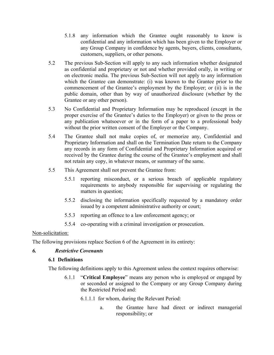 5.1.8 any information which the Grantee ought reasonably to know is confidential and any information which has been given to the Employer or any Group Company in confidence by agents, buyers, clients, consultants, customers, suppliers, or other persons. 5.2 The previous Sub-Section will apply to any such information whether designated as confidential and proprietary or not and whether provided orally, in writing or on electronic media. The previous Sub-Section will not apply to any information which the Grantee can demonstrate: (i) was known to the Grantee prior to the commencement of the Grantee’s employment by the Employer; or (ii) is in the public domain, other than by way of unauthorized disclosure (whether by the Grantee or any other person). 5.3 No Confidential and Proprietary Information may be reproduced (except in the proper exercise of the Grantee’s duties to the Employer) or given to the press or any publication whatsoever or in the form of a paper to a professional body without the prior written consent of the Employer or the Company. 5.4 The Grantee shall not make copies of, or memorize any, Confidential and Proprietary Information and shall on the Termination Date return to the Company any records in any form of Confidential and Proprietary Information acquired or received by the Grantee during the course of the Grantee’s employment and shall not retain any copy, in whatever means, or summary of the same. 5.5 This Agreement shall not prevent the Grantee from: 5.5.1 reporting misconduct, or a serious breach of applicable regulatory requirements to anybody responsible for supervising or regulating the matters in question; 5.5.2 disclosing the information specifically requested by a mandatory order issued by a competent administrative authority or court; 5.5.3 reporting an offence to a law enforcement agency; or 5.5.4 co-operating with a criminal investigation or prosecution. Non-solicitation: The following provisions replace Section 6 of the Agreement in its entirety: 6. Restrictive Covenants 6.1 Definitions The following definitions apply to this Agreement unless the context requires otherwise: 6.1.1 “Critical Employee” means any person who is employed or engaged by or seconded or assigned to the Company or any Group Company during the Restricted Period and: 6.1.1.1 for whom, during the Relevant Period: a. the Grantee have had direct or indirect managerial responsibility; or