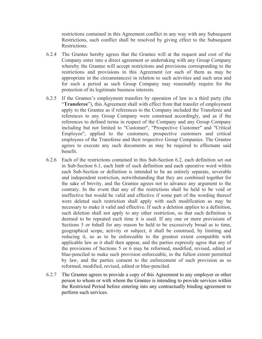 restrictions contained in this Agreement conflict in any way with any Subsequent Restrictions, such conflict shall be resolved by giving effect to the Subsequent Restrictions. 6.2.4 The Grantee hereby agrees that the Grantee will at the request and cost of the Company enter into a direct agreement or undertaking with any Group Company whereby the Grantee will accept restrictions and provisions corresponding to the restrictions and provisions in this Agreement (or such of them as may be appropriate in the circumstances) in relation to such activities and such area and for such a period as such Group Company may reasonably require for the protection of its legitimate business interests. 6.2.5 If the Grantee’s employment transfers by operation of law to a third party (the “Transferee”), this Agreement shall with effect from that transfer of employment apply to the Grantee as if references to the Company included the Transferee and references to any Group Company were construed accordingly, and as if the references to defined terms in respect of the Company and any Group Company including but not limited to "Customer", "Prospective Customer" and "Critical Employee", applied to the customers, prospective customers and critical employees of the Transferee and their respective Group Companies. The Grantee agrees to execute any such documents as may be required to effectuate said benefit. 6.2.6 Each of the restrictions contained in this Sub-Section 6.2, each definition set out in Sub-Section 6.1, each limb of such definition and each operative word within each Sub-Section or definition is intended to be an entirely separate, severable and independent restriction, notwithstanding that they are combined together for the sake of brevity, and the Grantee agrees not to advance any argument to the contrary. In the event that any of the restrictions shall be held to be void or ineffective but would be valid and effective if some part of the wording thereof were deleted such restriction shall apply with such modification as may be necessary to make it valid and effective. If such a deletion applies to a definition, such deletion shall not apply to any other restriction, so that each definition is deemed to be repeated each time it is used. If any one or more provisions of Sections 5 or 6shall for any reason be held to be excessively broad as to time, geographical scope, activity or subject, it shall be construed, by limiting and reducing it, so as to be enforceable to the greatest extent compatible with applicable law as it shall then appear, and the parties expressly agree that any of the provisions of Sections 5 or 6 may be reformed, modified, revised, edited or blue-penciled to make such provision enforceable, to the fullest extent permitted by law, and the parties consent to the enforcement of such provision as so reformed, modified, revised, edited or blue-penciled. 6.2.7 The Grantee agrees to provide a copy of this Agreement to any employer or other person to whom or with whom the Grantee is intending to provide services within the Restricted Period before entering into any contractually binding agreement to perform such services.