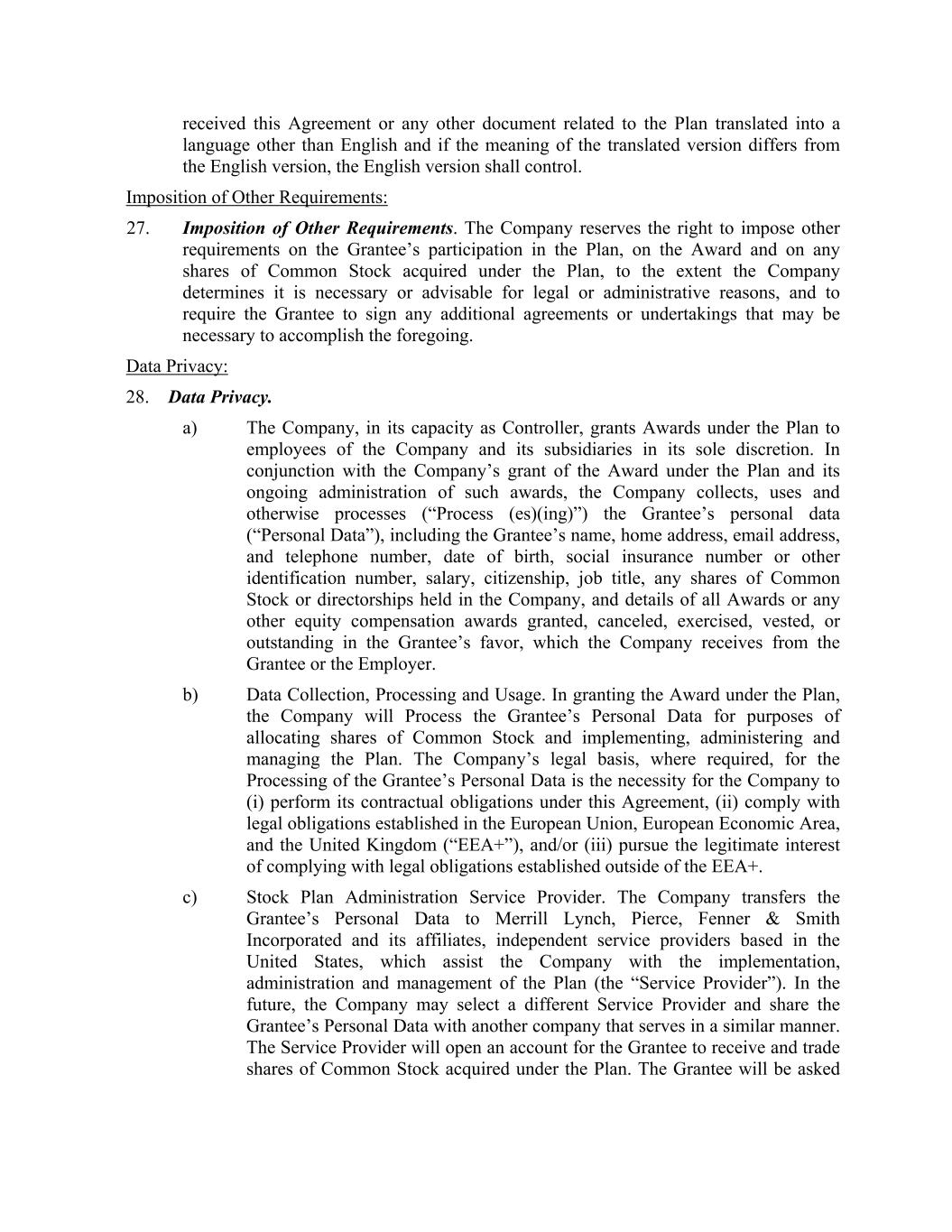 received this Agreement or any other document related to the Plan translated into a language other than English and if the meaning of the translated version differs from the English version, the English version shall control. Imposition of Other Requirements: 27. Imposition of Other Requirements. The Company reserves the right to impose other requirements on the Grantee’s participation in the Plan, on the Award and on any shares of Common Stock acquired under the Plan, to the extent the Company determines it is necessary or advisable for legal or administrative reasons, and to require the Grantee to sign any additional agreements or undertakings that may be necessary to accomplish the foregoing. Data Privacy: 28. Data Privacy. a) The Company, in its capacity as Controller, grants Awards under the Plan to employees of the Company and its subsidiaries in its sole discretion. In conjunction with the Company’s grant of the Award under the Plan and its ongoing administration of such awards, the Company collects, uses and otherwise processes (“Process (es)(ing)”) the Grantee’s personal data (“Personal Data”), including the Grantee’s name, home address, email address, and telephone number, date of birth, social insurance number or other identification number, salary, citizenship, job title, any shares of Common Stock or directorships held in the Company, and details of all Awards or any other equity compensation awards granted, canceled, exercised, vested, or outstanding in the Grantee’s favor, which the Company receives from the Grantee or the Employer. b) Data Collection, Processing and Usage. In granting the Award under the Plan, the Company will Process the Grantee’s Personal Data for purposes of allocating shares of Common Stock and implementing, administering and managing the Plan. The Company’s legal basis, where required, for the Processing of the Grantee’s Personal Data is the necessity for the Company to (i) perform its contractual obligations under this Agreement, (ii) comply with legal obligations established in the European Union, European Economic Area, and the United Kingdom (“EEA+”), and/or (iii) pursue the legitimate interest of complying with legal obligations established outside of the EEA+. c) Stock Plan Administration Service Provider. The Company transfers the Grantee’s Personal Data to Merrill Lynch, Pierce, Fenner & Smith Incorporated and its affiliates, independent service providers based in the United States, which assist the Company with the implementation, administration and management of the Plan (the “Service Provider”). In the future, the Company may select a different Service Provider and share the Grantee’s Personal Data with another company that serves in a similar manner. The Service Provider will open an account for the Grantee to receive and trade shares of Common Stock acquired under the Plan. The Grantee will be asked