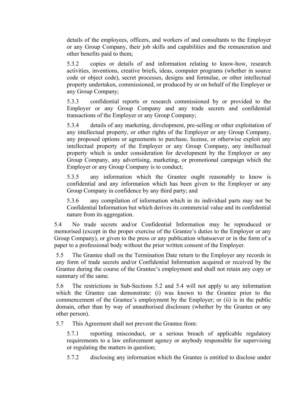 details of the employees, officers, and workers of and consultants to the Employer or any Group Company, their job skills and capabilities and the remuneration and other benefits paid to them; 5.3.2 copies or details of and information relating to know-how, research activities, inventions, creative briefs, ideas, computer programs (whether in source code or object code), secret processes, designs and formulae, or other intellectual property undertaken, commissioned, or produced by or on behalf of the Employer or any Group Company; 5.3.3 confidential reports or research commissioned by or provided to the Employer or any Group Company and any trade secrets and confidential transactions of the Employer or any Group Company; 5.3.4 details of any marketing, development, pre-selling or other exploitation of any intellectual property, or other rights of the Employer or any Group Company, any proposed options or agreements to purchase, license, or otherwise exploit any intellectual property of the Employer or any Group Company, any intellectual property which is under consideration for development by the Employer or any Group Company, any advertising, marketing, or promotional campaign which the Employer or any Group Company is to conduct; 5.3.5 any information which the Grantee ought reasonably to know is confidential and any information which has been given to the Employer or any Group Company in confidence by any third party; and 5.3.6 any compilation of information which in its individual parts may not be Confidential Information but which derives its commercial value and its confidential nature from its aggregation. 5.4 No trade secrets and/or Confidential Information may be reproduced or memorised (except in the proper exercise of the Grantee’s duties to the Employer or any Group Company), or given to the press or any publication whatsoever or in the form of a paper to a professional body without the prior written consent of the Employer. 5.5 The Grantee shall on the Termination Date return to the Employer any records in any form of trade secrets and/or Confidential Information acquired or received by the Grantee during the course of the Grantee’s employment and shall not retain any copy or summary of the same. 5.6 The restrictions in Sub-Sections 5.2 and 5.4 will not apply to any information which the Grantee can demonstrate: (i) was known to the Grantee prior to the commencement of the Grantee’s employment by the Employer; or (ii) is in the public domain, other than by way of unauthorised disclosure (whether by the Grantee or any other person). 5.7 This Agreement shall not prevent the Grantee from: 5.7.1 reporting misconduct, or a serious breach of applicable regulatory requirements to a law enforcement agency or anybody responsible for supervising or regulating the matters in question; 5.7.2 disclosing any information which the Grantee is entitled to disclose under