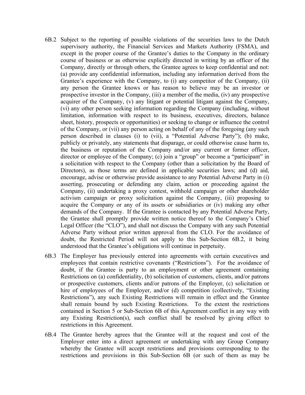 6B.2 Subject to the reporting of possible violations of the securities laws to the Dutch supervisory authority, the Financial Services and Markets Authority (FSMA), and except in the proper course of the Grantee’s duties to the Company in the ordinary course of business or as otherwise explicitly directed in writing by an officer of the Company, directly or through others, the Grantee agrees to keep confidential and not: (a) provide any confidential information, including any information derived from the Grantee’s experience with the Company, to (i) any competitor of the Company, (ii) any person the Grantee knows or has reason to believe may be an investor or prospective investor in the Company, (iii) a member of the media, (iv) any prospective acquirer of the Company, (v) any litigant or potential litigant against the Company, (vi) any other person seeking information regarding the Company (including, without limitation, information with respect to its business, executives, directors, balance sheet, history, prospects or opportunities) or seeking to change or influence the control of the Company, or (vii) any person acting on behalf of any of the foregoing (any such person described in clauses (i) to (vii), a “Potential Adverse Party”); (b) make, publicly or privately, any statements that disparage, or could otherwise cause harm to, the business or reputation of the Company and/or any current or former officer, director or employee of the Company; (c) join a “group” or become a “participant” in a solicitation with respect to the Company (other than a solicitation by the Board of Directors), as those terms are defined in applicable securities laws; and (d) aid, encourage, advise or otherwise provide assistance to any Potential Adverse Party in (i) asserting, prosecuting or defending any claim, action or proceeding against the Company, (ii) undertaking a proxy contest, withhold campaign or other shareholder activism campaign or proxy solicitation against the Company, (iii) proposing to acquire the Company or any of its assets or subsidiaries or (iv) making any other demands of the Company. If the Grantee is contacted by any Potential Adverse Party, the Grantee shall promptly provide written notice thereof to the Company’s Chief Legal Officer (the “CLO”), and shall not discuss the Company with any such Potential Adverse Party without prior written approval from the CLO. For the avoidance of doubt, the Restricted Period will not apply to this Sub-Section 6B.2, it being understood that the Grantee’s obligations will continue in perpetuity. 6B.3 The Employer has previously entered into agreements with certain executives and employees that contain restrictive covenants (“Restrictions”). For the avoidance of doubt, if the Grantee is party to an employment or other agreement containing Restrictions on (a) confidentiality, (b) solicitation of customers, clients, and/or patrons or prospective customers, clients and/or patrons of the Employer, (c) solicitation or hire of employees of the Employer, and/or (d) competition (collectively, “Existing Restrictions”), any such Existing Restrictions will remain in effect and the Grantee shall remain bound by such Existing Restrictions. To the extent the restrictions contained in Section 5 or Sub-Section 6B of this Agreement conflict in any way with any Existing Restriction(s), such conflict shall be resolved by giving effect to restrictions in this Agreement. 6B.4 The Grantee hereby agrees that the Grantee will at the request and cost of the Employer enter into a direct agreement or undertaking with any Group Company whereby the Grantee will accept restrictions and provisions corresponding to the restrictions and provisions in this Sub-Section 6B (or such of them as may be