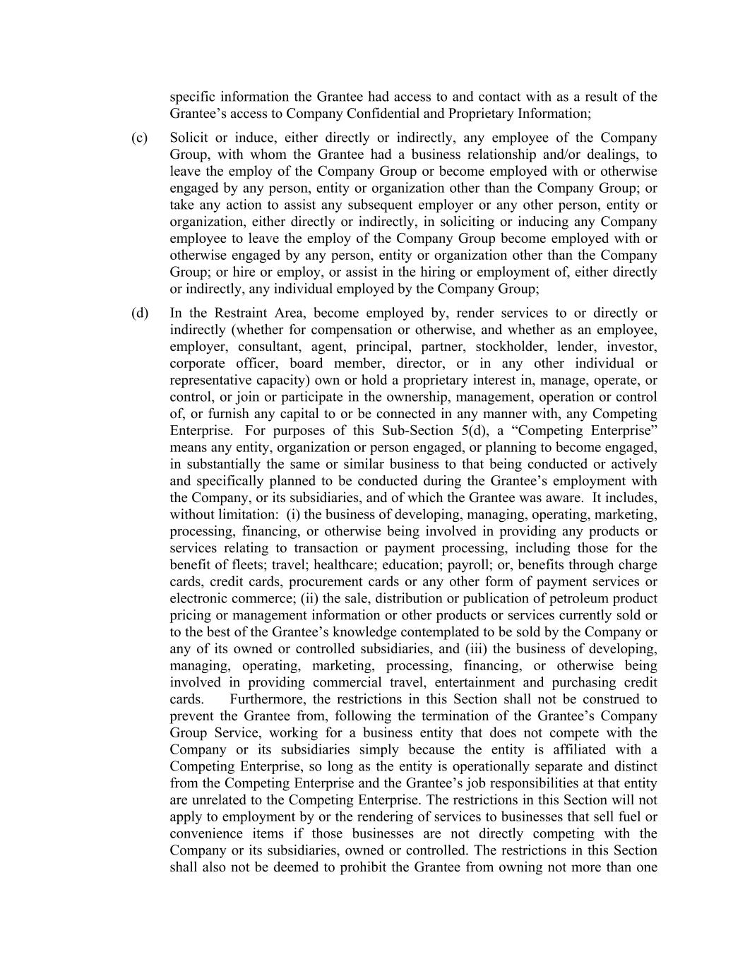 specific information the Grantee had access to and contact with as a result of the Grantee’s access to Company Confidential and Proprietary Information; (c) Solicit or induce, either directly or indirectly, any employee of the Company Group, with whom the Grantee had a business relationship and/or dealings, to leave the employ of the Company Group or become employed with or otherwise engaged by any person, entity or organization other than the Company Group; or take any action to assist any subsequent employer or any other person, entity or organization, either directly or indirectly, in soliciting or inducing any Company employee to leave the employ of the Company Group become employed with or otherwise engaged by any person, entity or organization other than the Company Group; or hire or employ, or assist in the hiring or employment of, either directly or indirectly, any individual employed by the Company Group; (d) In the Restraint Area, become employed by, render services to or directly or indirectly (whether for compensation or otherwise, and whether as an employee, employer, consultant, agent, principal, partner, stockholder, lender, investor, corporate officer, board member, director, or in any other individual or representative capacity) own or hold a proprietary interest in, manage, operate, or control, or join or participate in the ownership, management, operation or control of, or furnish any capital to or be connected in any manner with, any Competing Enterprise. For purposes of this Sub-Section 5(d), a “Competing Enterprise” means any entity, organization or person engaged, or planning to become engaged, in substantially the same or similar business to that being conducted or actively and specifically planned to be conducted during the Grantee’s employment with the Company, or its subsidiaries, and of which the Grantee was aware. It includes, without limitation: (i) the business of developing, managing, operating, marketing, processing, financing, or otherwise being involved in providing any products or services relating to transaction or payment processing, including those for the benefit of fleets; travel; healthcare; education; payroll; or, benefits through charge cards, credit cards, procurement cards or any other form of payment services or electronic commerce; (ii) the sale, distribution or publication of petroleum product pricing or management information or other products or services currently sold or to the best of the Grantee’s knowledge contemplated to be sold by the Company or any of its owned or controlled subsidiaries, and (iii) the business of developing, managing, operating, marketing, processing, financing, or otherwise being involved in providing commercial travel, entertainment and purchasing credit cards. Furthermore, the restrictions in this Section shall not be construed to prevent the Grantee from, following the termination of the Grantee’s Company Group Service, working for a business entity that does not compete with the Company or its subsidiaries simply because the entity is affiliated with a Competing Enterprise, so long as the entity is operationally separate and distinct from the Competing Enterprise and the Grantee’s job responsibilities at that entity are unrelated to the Competing Enterprise. The restrictions in this Section will not apply to employment by or the rendering of services to businesses that sell fuel or convenience items if those businesses are not directly competing with the Company or its subsidiaries, owned or controlled. The restrictions in this Section shall also not be deemed to prohibit the Grantee from owning not more than one