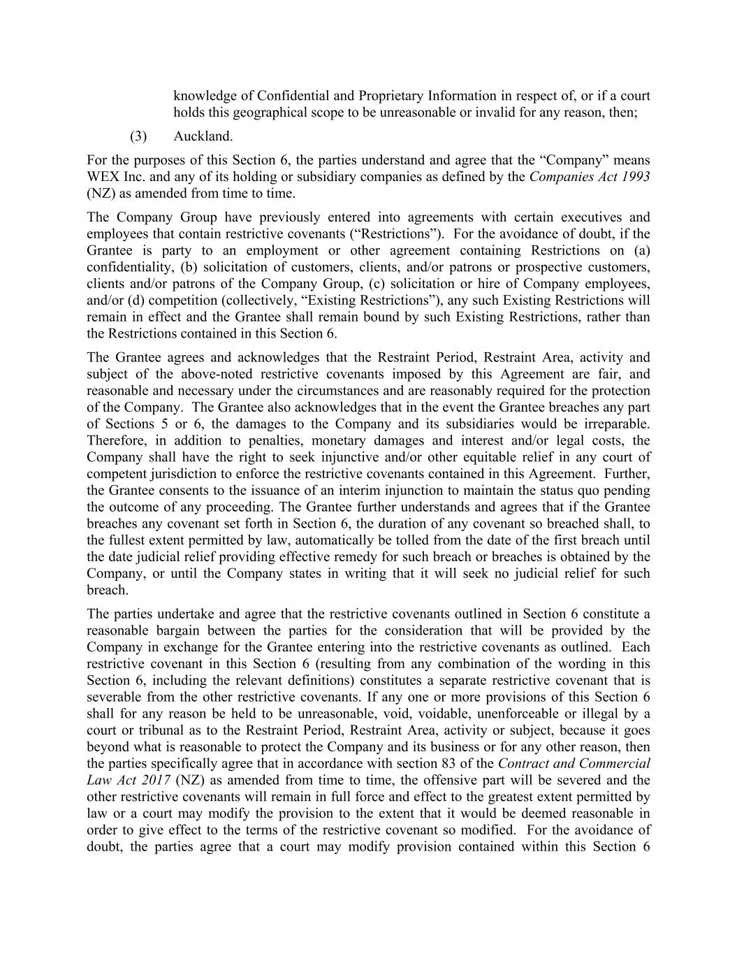 knowledge of Confidential and Proprietary Information in respect of, or if a court holds this geographical scope to be unreasonable or invalid for any reason, then; (3) Auckland. For the purposes of this Section 6, the parties understand and agree that the “Company” means WEX Inc. and any of its holding or subsidiary companies as defined by the Companies Act 1993 (NZ) as amended from time to time. The Company Group have previously entered into agreements with certain executives and employees that contain restrictive covenants (“Restrictions”). For the avoidance of doubt, if the Grantee is party to an employment or other agreement containing Restrictions on (a) confidentiality, (b) solicitation of customers, clients, and/or patrons or prospective customers, clients and/or patrons of the Company Group, (c) solicitation or hire of Company employees, and/or (d) competition (collectively, “Existing Restrictions”), any such Existing Restrictions will remain in effect and the Grantee shall remain bound by such Existing Restrictions, rather than the Restrictions contained in this Section 6. The Grantee agrees and acknowledges that the Restraint Period, Restraint Area, activity and subject of the above-noted restrictive covenants imposed by this Agreement are fair, and reasonable and necessary under the circumstances and are reasonably required for the protection of the Company. The Grantee also acknowledges that in the event the Grantee breaches any part of Sections 5 or 6, the damages to the Company and its subsidiaries would be irreparable. Therefore, in addition to penalties, monetary damages and interest and/or legal costs, the Company shall have the right to seek injunctive and/or other equitable relief in any court of competent jurisdiction to enforce the restrictive covenants contained in this Agreement. Further, the Grantee consents to the issuance of an interim injunction to maintain the status quo pending the outcome of any proceeding. The Grantee further understands and agrees that if the Grantee breaches any covenant set forth in Section 6, the duration of any covenant so breached shall, to the fullest extent permitted by law, automatically be tolled from the date of the first breach until the date judicial relief providing effective remedy for such breach or breaches is obtained by the Company, or until the Company states in writing that it will seek no judicial relief for such breach. The parties undertake and agree that the restrictive covenants outlined in Section 6 constitute a reasonable bargain between the parties for the consideration that will be provided by the Company in exchange for the Grantee entering into the restrictive covenants as outlined. Each restrictive covenant in this Section 6 (resulting from any combination of the wording in this Section 6, including the relevant definitions) constitutes a separate restrictive covenant that is severable from the other restrictive covenants. If any one or more provisions of this Section 6 shall for any reason be held to be unreasonable, void, voidable, unenforceable or illegal by a court or tribunal as to the Restraint Period, Restraint Area, activity or subject, because it goes beyond what is reasonable to protect the Company and its business or for any other reason, then the parties specifically agree that in accordance with section 83 of the Contract and Commercial Law Act 2017 (NZ) as amended from time to time, the offensive part will be severed and the other restrictive covenants will remain in full force and effect to the greatest extent permitted by law or a court may modify the provision to the extent that it would be deemed reasonable in order to give effect to the terms of the restrictive covenant so modified. For the avoidance of doubt, the parties agree that a court may modify provision contained within this Section 6