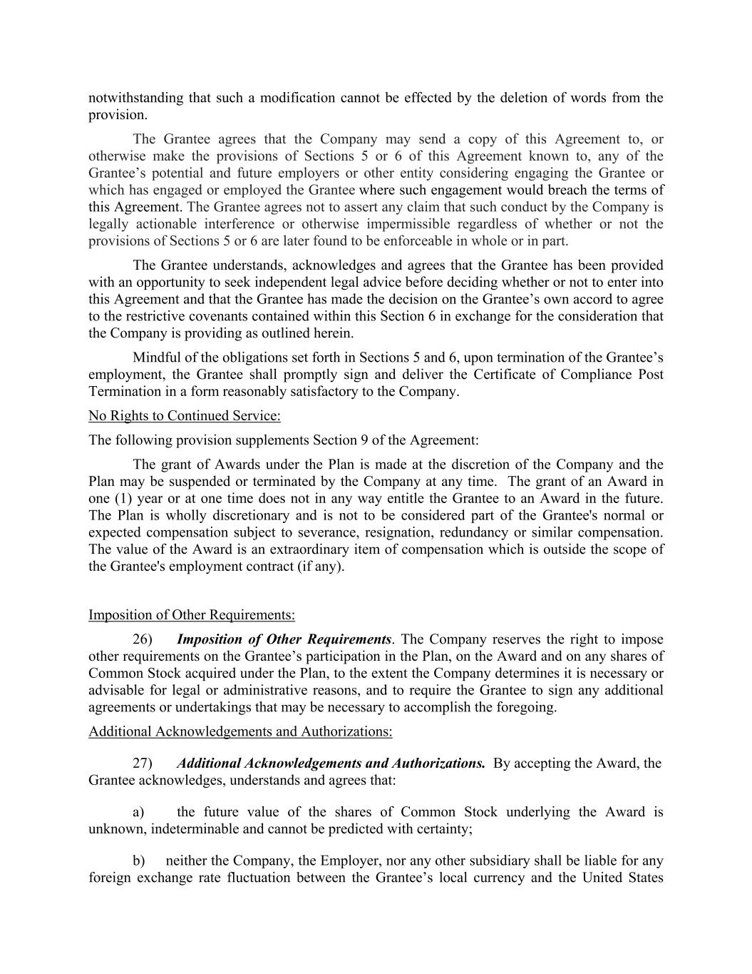 notwithstanding that such a modification cannot be effected by the deletion of words from the provision. The Grantee agrees that the Company may send a copy of this Agreement to, or otherwise make the provisions of Sections 5 or 6 of this Agreement known to, any of the Grantee’s potential and future employers or other entity considering engaging the Grantee or which has engaged or employed the Grantee where such engagement would breach the terms of this Agreement. The Grantee agrees not to assert any claim that such conduct by the Company is legally actionable interference or otherwise impermissible regardless of whether or not the provisions of Sections 5 or 6 are later found to be enforceable in whole or in part. The Grantee understands, acknowledges and agrees that the Grantee has been provided with an opportunity to seek independent legal advice before deciding whether or not to enter into this Agreement and that the Grantee has made the decision on the Grantee’s own accord to agree to the restrictive covenants contained within this Section 6 in exchange for the consideration that the Company is providing as outlined herein. Mindful of the obligations set forth in Sections 5 and 6, upon termination of the Grantee’s employment, the Grantee shall promptly sign and deliver the Certificate of Compliance Post Termination in a form reasonably satisfactory to the Company. No Rights to Continued Service: The following provision supplements Section 9 of the Agreement: The grant of Awards under the Plan is made at the discretion of the Company and the Plan may be suspended or terminated by the Company at any time. The grant of an Award in one (1) year or at one time does not in any way entitle the Grantee to an Award in the future. The Plan is wholly discretionary and is not to be considered part of the Grantee's normal or expected compensation subject to severance, resignation, redundancy or similar compensation. The value of the Award is an extraordinary item of compensation which is outside the scope of the Grantee's employment contract (if any). Imposition of Other Requirements: 26) Imposition of Other Requirements. The Company reserves the right to impose other requirements on the Grantee’s participation in the Plan, on the Award and on any shares of Common Stock acquired under the Plan, to the extent the Company determines it is necessary or advisable for legal or administrative reasons, and to require the Grantee to sign any additional agreements or undertakings that may be necessary to accomplish the foregoing. Additional Acknowledgements and Authorizations: 27) Additional Acknowledgements and Authorizations. By accepting the Award, the Grantee acknowledges, understands and agrees that: a) the future value of the shares of Common Stock underlying the Award is unknown, indeterminable and cannot be predicted with certainty; b) neither the Company, the Employer, nor any other subsidiary shall be liable for any foreign exchange rate fluctuation between the Grantee’s local currency and the United States