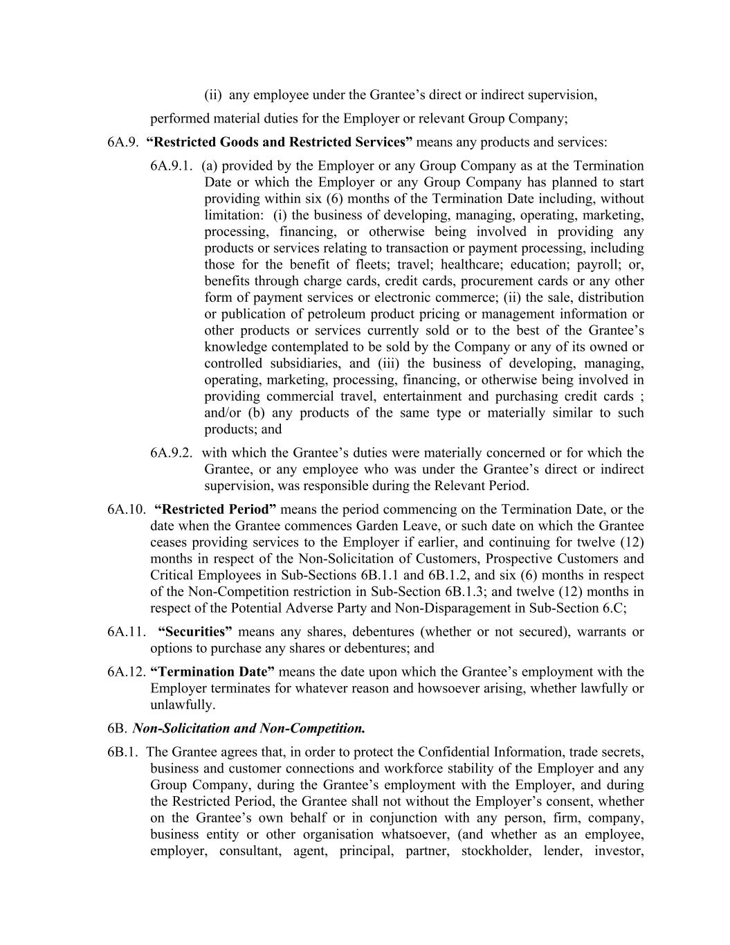 (ii) any employee under the Grantee’s direct or indirect supervision, performed material duties for the Employer or relevant Group Company; 6A.9. “Restricted Goods and Restricted Services” means any products and services: 6A.9.1. (a) provided by the Employer or any Group Company as at the Termination Date or which the Employer or any Group Company has planned to start providing within six (6) months of the Termination Date including, without limitation: (i) the business of developing, managing, operating, marketing, processing, financing, or otherwise being involved in providing any products or services relating to transaction or payment processing, including those for the benefit of fleets; travel; healthcare; education; payroll; or, benefits through charge cards, credit cards, procurement cards or any other form of payment services or electronic commerce; (ii) the sale, distribution or publication of petroleum product pricing or management information or other products or services currently sold or to the best of the Grantee’s knowledge contemplated to be sold by the Company or any of its owned or controlled subsidiaries, and (iii) the business of developing, managing, operating, marketing, processing, financing, or otherwise being involved in providing commercial travel, entertainment and purchasing credit cards ; and/or (b) any products of the same type or materially similar to such products; and 6A.9.2. with which the Grantee’s duties were materially concerned or for which the Grantee, or any employee who was under the Grantee’s direct or indirect supervision, was responsible during the Relevant Period. 6A.10. “Restricted Period” means the period commencing on the Termination Date, or the date when the Grantee commences Garden Leave, or such date on which the Grantee ceases providing services to the Employer if earlier, and continuing for twelve (12) months in respect of the Non-Solicitation of Customers, Prospective Customers and Critical Employees in Sub-Sections 6B.1.1 and 6B.1.2, and six (6) months in respect of the Non-Competition restriction in Sub-Section 6B.1.3; and twelve (12) months in respect of the Potential Adverse Party and Non-Disparagement in Sub-Section 6.C; 6A.11. “Securities” means any shares, debentures (whether or not secured), warrants or options to purchase any shares or debentures; and 6A.12. “Termination Date” means the date upon which the Grantee’s employment with the Employer terminates for whatever reason and howsoever arising, whether lawfully or unlawfully. 6B. Non-Solicitation and Non-Competition. 6B.1. The Grantee agrees that, in order to protect the Confidential Information, trade secrets, business and customer connections and workforce stability of the Employer and any Group Company, during the Grantee’s employment with the Employer, and during the Restricted Period, the Grantee shall not without the Employer’s consent, whether on the Grantee’s own behalf or in conjunction with any person, firm, company, business entity or other organisation whatsoever, (and whether as an employee, employer, consultant, agent, principal, partner, stockholder, lender, investor,