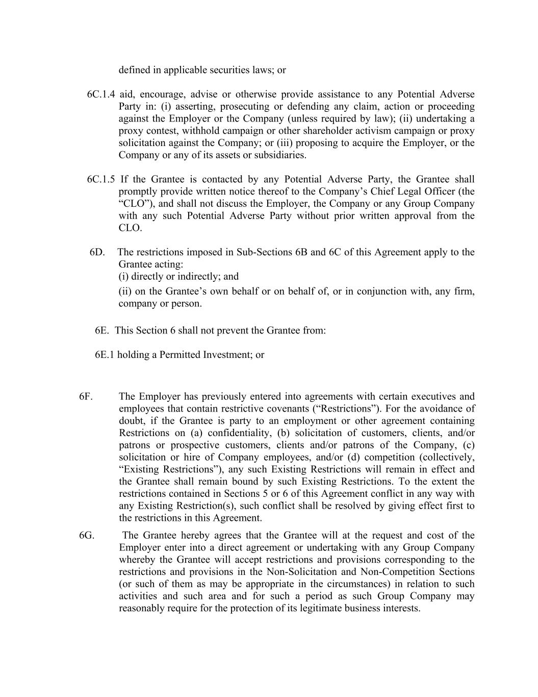 defined in applicable securities laws; or 6C.1.4 aid, encourage, advise or otherwise provide assistance to any Potential Adverse Party in: (i) asserting, prosecuting or defending any claim, action or proceeding against the Employer or the Company (unless required by law); (ii) undertaking a proxy contest, withhold campaign or other shareholder activism campaign or proxy solicitation against the Company; or (iii) proposing to acquire the Employer, or the Company or any of its assets or subsidiaries. 6C.1.5 If the Grantee is contacted by any Potential Adverse Party, the Grantee shall promptly provide written notice thereof to the Company’s Chief Legal Officer (the “CLO”), and shall not discuss the Employer, the Company or any Group Company with any such Potential Adverse Party without prior written approval from the CLO. 6D. The restrictions imposed in Sub-Sections 6B and 6C of this Agreement apply to the Grantee acting: (i) directly or indirectly; and (ii) on the Grantee’s own behalf or on behalf of, or in conjunction with, any firm, company or person. 6E. This Section 6 shall not prevent the Grantee from: 6E.1 holding a Permitted Investment; or 6F. The Employer has previously entered into agreements with certain executives and employees that contain restrictive covenants (“Restrictions”). For the avoidance of doubt, if the Grantee is party to an employment or other agreement containing Restrictions on (a) confidentiality, (b) solicitation of customers, clients, and/or patrons or prospective customers, clients and/or patrons of the Company, (c) solicitation or hire of Company employees, and/or (d) competition (collectively, “Existing Restrictions”), any such Existing Restrictions will remain in effect and the Grantee shall remain bound by such Existing Restrictions. To the extent the restrictions contained in Sections 5 or 6 of this Agreement conflict in any way with any Existing Restriction(s), such conflict shall be resolved by giving effect first to the restrictions in this Agreement. 6G. The Grantee hereby agrees that the Grantee will at the request and cost of the Employer enter into a direct agreement or undertaking with any Group Company whereby the Grantee will accept restrictions and provisions corresponding to the restrictions and provisions in the Non-Solicitation and Non-Competition Sections (or such of them as may be appropriate in the circumstances) in relation to such activities and such area and for such a period as such Group Company may reasonably require for the protection of its legitimate business interests.
