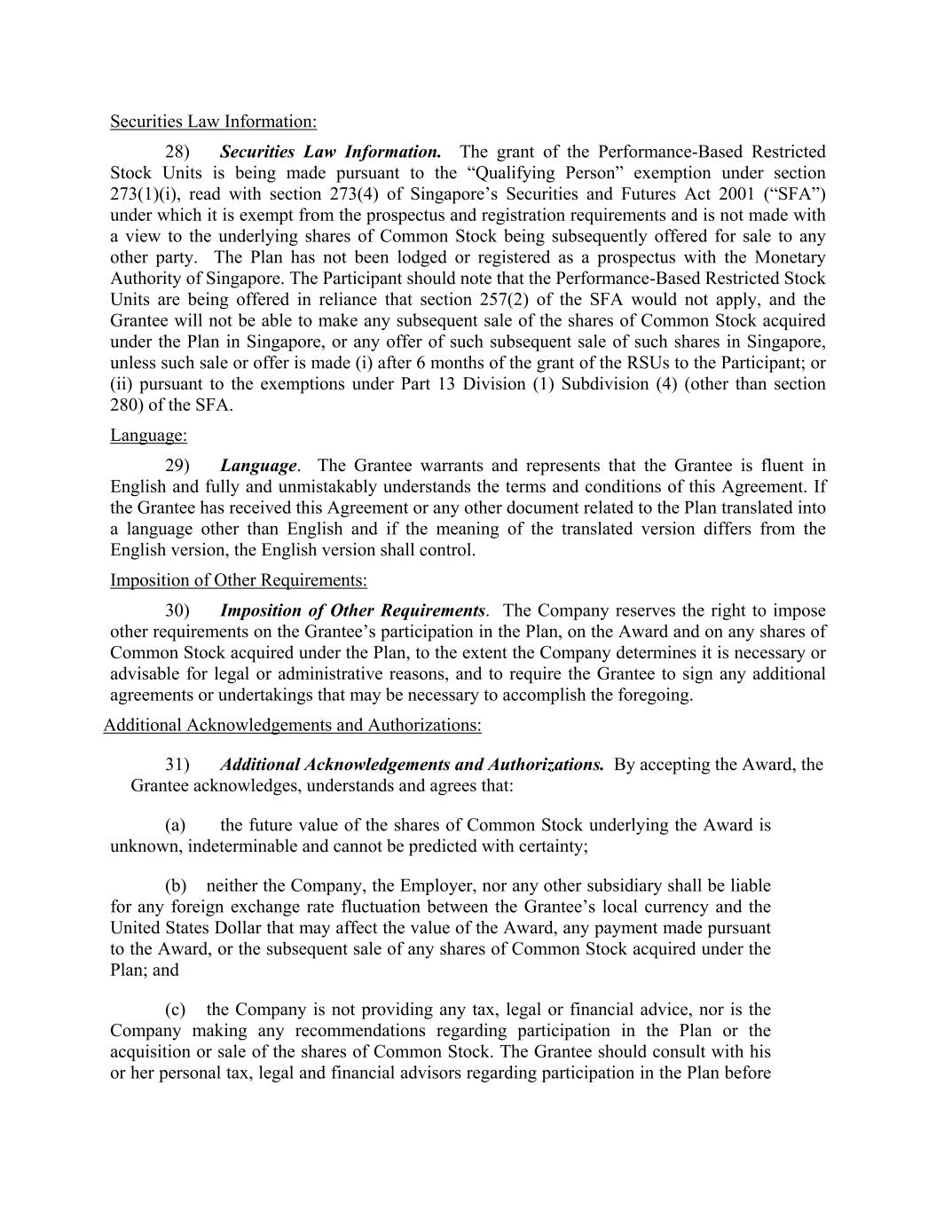 Securities Law Information: 28) Securities Law Information. The grant of the Performance-Based Restricted Stock Units is being made pursuant to the “Qualifying Person” exemption under section 273(1)(i), read with section 273(4) of Singapore’s Securities and Futures Act 2001 (“SFA”) under which it is exempt from the prospectus and registration requirements and is not made with a view to the underlying shares of Common Stock being subsequently offered for sale to any other party. The Plan has not been lodged or registered as a prospectus with the Monetary Authority of Singapore. The Participant should note that the Performance-Based Restricted Stock Units are being offered in reliance that section 257(2) of the SFA would not apply, and the Grantee will not be able to make any subsequent sale of the shares of Common Stock acquired under the Plan in Singapore, or any offer of such subsequent sale of such shares in Singapore, unless such sale or offer is made (i) after 6 months of the grant of the RSUs to the Participant; or (ii) pursuant to the exemptions under Part 13 Division (1) Subdivision (4) (other than section 280) of the SFA. Language: 29) Language. The Grantee warrants and represents that the Grantee is fluent in English and fully and unmistakably understands the terms and conditions of this Agreement. If the Grantee has received this Agreement or any other document related to the Plan translated into a language other than English and if the meaning of the translated version differs from the English version, the English version shall control. Imposition of Other Requirements: 30) Imposition of Other Requirements. The Company reserves the right to impose other requirements on the Grantee’s participation in the Plan, on the Award and on any shares of Common Stock acquired under the Plan, to the extent the Company determines it is necessary or advisable for legal or administrative reasons, and to require the Grantee to sign any additional agreements or undertakings that may be necessary to accomplish the foregoing. Additional Acknowledgements and Authorizations: 31) Additional Acknowledgements and Authorizations. By accepting the Award, the Grantee acknowledges, understands and agrees that: (a) the future value of the shares of Common Stock underlying the Award is unknown, indeterminable and cannot be predicted with certainty; (b) neither the Company, the Employer, nor any other subsidiary shall be liable for any foreign exchange rate fluctuation between the Grantee’s local currency and the United States Dollar that may affect the value of the Award, any payment made pursuant to the Award, or the subsequent sale of any shares of Common Stock acquired under the Plan; and (c) the Company is not providing any tax, legal or financial advice, nor is the Company making any recommendations regarding participation in the Plan or the acquisition or sale of the shares of Common Stock. The Grantee should consult with his or her personal tax, legal and financial advisors regarding participation in the Plan before