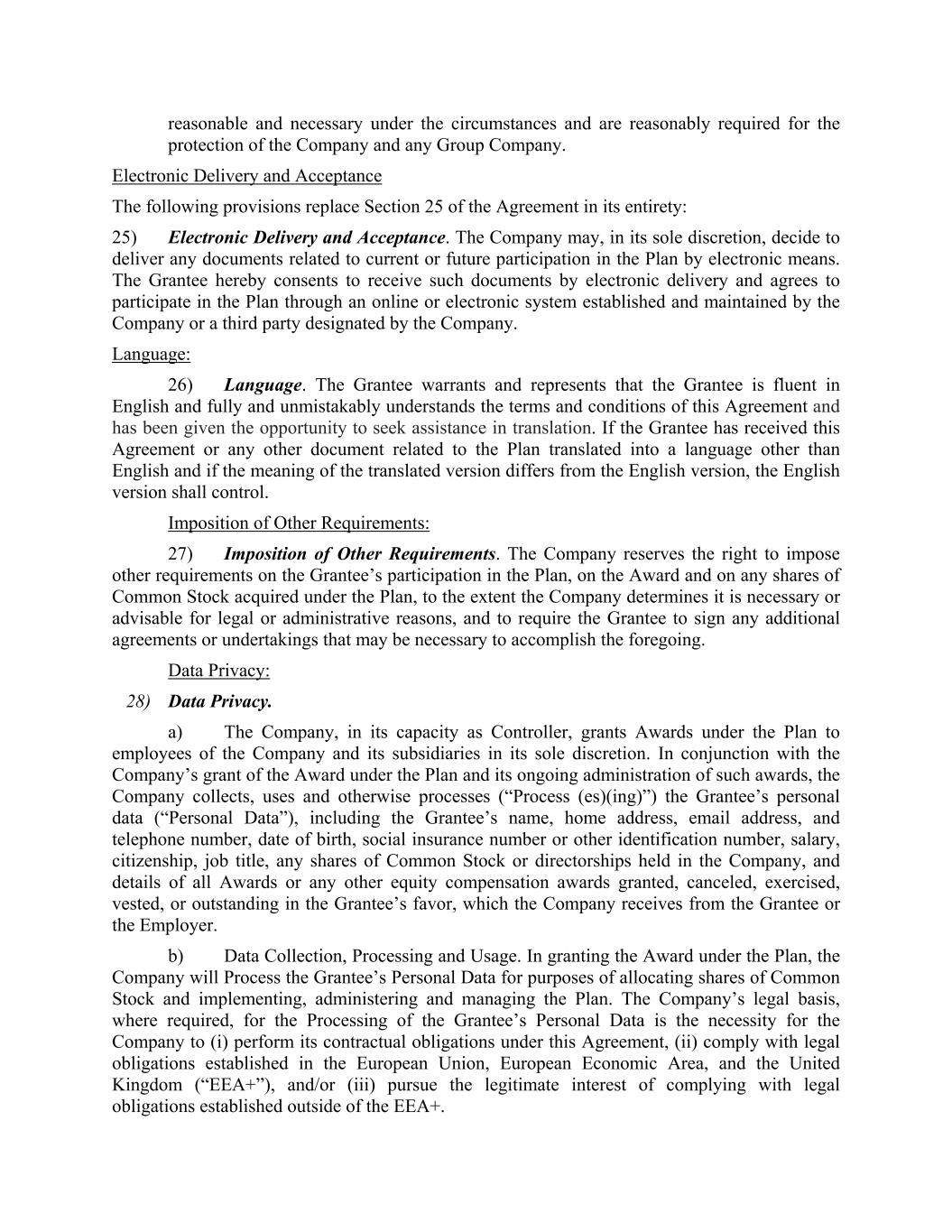 reasonable and necessary under the circumstances and are reasonably required for the protection of the Company and any Group Company. Electronic Delivery and Acceptance The following provisions replace Section 25 of the Agreement in its entirety: 25) Electronic Delivery and Acceptance. The Company may, in its sole discretion, decide to deliver any documents related to current or future participation in the Plan by electronic means. The Grantee hereby consents to receive such documents by electronic delivery and agrees to participate in the Plan through an online or electronic system established and maintained by the Company or a third party designated by the Company. Language: 26) Language. The Grantee warrants and represents that the Grantee is fluent in English and fully and unmistakably understands the terms and conditions of this Agreement and has been given the opportunity to seek assistance in translation. If the Grantee has received this Agreement or any other document related to the Plan translated into a language other than English and if the meaning of the translated version differs from the English version, the English version shall control. Imposition of Other Requirements: 27) Imposition of Other Requirements. The Company reserves the right to impose other requirements on the Grantee’s participation in the Plan, on the Award and on any shares of Common Stock acquired under the Plan, to the extent the Company determines it is necessary or advisable for legal or administrative reasons, and to require the Grantee to sign any additional agreements or undertakings that may be necessary to accomplish the foregoing. Data Privacy: 28) Data Privacy. a) The Company, in its capacity as Controller, grants Awards under the Plan to employees of the Company and its subsidiaries in its sole discretion. In conjunction with the Company’s grant of the Award under the Plan and its ongoing administration of such awards, the Company collects, uses and otherwise processes (“Process (es)(ing)”) the Grantee’s personal data (“Personal Data”), including the Grantee’s name, home address, email address, and telephone number, date of birth, social insurance number or other identification number, salary, citizenship, job title, any shares of Common Stock or directorships held in the Company, and details of all Awards or any other equity compensation awards granted, canceled, exercised, vested, or outstanding in the Grantee’s favor, which the Company receives from the Grantee or the Employer. b) Data Collection, Processing and Usage. In granting the Award under the Plan, the Company will Process the Grantee’s Personal Data for purposes of allocating shares of Common Stock and implementing, administering and managing the Plan. The Company’s legal basis, where required, for the Processing of the Grantee’s Personal Data is the necessity for the Company to (i) perform its contractual obligations under this Agreement, (ii) comply with legal obligations established in the European Union, European Economic Area, and the United Kingdom (“EEA+”), and/or (iii) pursue the legitimate interest of complying with legal obligations established outside of the EEA+.