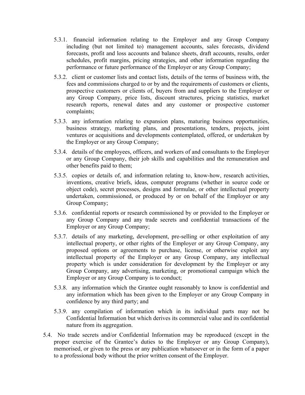 5.3.1. financial information relating to the Employer and any Group Company including (but not limited to) management accounts, sales forecasts, dividend forecasts, profit and loss accounts and balance sheets, draft accounts, results, order schedules, profit margins, pricing strategies, and other information regarding the performance or future performance of the Employer or any Group Company; 5.3.2. client or customer lists and contact lists, details of the terms of business with, the fees and commissions charged to or by and the requirements of customers or clients, prospective customers or clients of, buyers from and suppliers to the Employer or any Group Company, price lists, discount structures, pricing statistics, market research reports, renewal dates and any customer or prospective customer complaints; 5.3.3. any information relating to expansion plans, maturing business opportunities, business strategy, marketing plans, and presentations, tenders, projects, joint ventures or acquisitions and developments contemplated, offered, or undertaken by the Employer or any Group Company; 5.3.4. details of the employees, officers, and workers of and consultants to the Employer or any Group Company, their job skills and capabilities and the remuneration and other benefits paid to them; 5.3.5. copies or details of, and information relating to, know-how, research activities, inventions, creative briefs, ideas, computer programs (whether in source code or object code), secret processes, designs and formulae, or other intellectual property undertaken, commissioned, or produced by or on behalf of the Employer or any Group Company; 5.3.6. confidential reports or research commissioned by or provided to the Employer or any Group Company and any trade secrets and confidential transactions of the Employer or any Group Company; 5.3.7. details of any marketing, development, pre-selling or other exploitation of any intellectual property, or other rights of the Employer or any Group Company, any proposed options or agreements to purchase, license, or otherwise exploit any intellectual property of the Employer or any Group Company, any intellectual property which is under consideration for development by the Employer or any Group Company, any advertising, marketing, or promotional campaign which the Employer or any Group Company is to conduct; 5.3.8. any information which the Grantee ought reasonably to know is confidential and any information which has been given to the Employer or any Group Company in confidence by any third party; and 5.3.9. any compilation of information which in its individual parts may not be Confidential Information but which derives its commercial value and its confidential nature from its aggregation. 5.4. No trade secrets and/or Confidential Information may be reproduced (except in the proper exercise of the Grantee’s duties to the Employer or any Group Company), memorised, or given to the press or any publication whatsoever or in the form of a paper to a professional body without the prior written consent of the Employer.