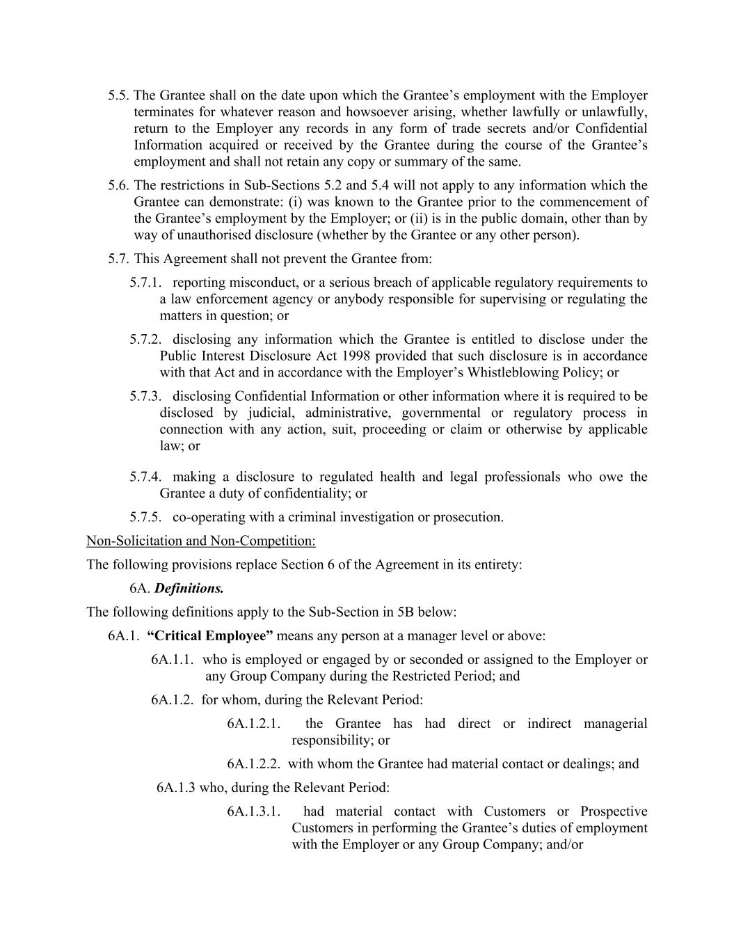 5.5. The Grantee shall on the date upon which the Grantee’s employment with the Employer terminates for whatever reason and howsoever arising, whether lawfully or unlawfully, return to the Employer any records in any form of trade secrets and/or Confidential Information acquired or received by the Grantee during the course of the Grantee’s employment and shall not retain any copy or summary of the same. 5.6. The restrictions in Sub-Sections 5.2 and 5.4 will not apply to any information which the Grantee can demonstrate: (i) was known to the Grantee prior to the commencement of the Grantee’s employment by the Employer; or (ii) is in the public domain, other than by way of unauthorised disclosure (whether by the Grantee or any other person). 5.7. This Agreement shall not prevent the Grantee from: 5.7.1. reporting misconduct, or a serious breach of applicable regulatory requirements to a law enforcement agency or anybody responsible for supervising or regulating the matters in question; or 5.7.2. disclosing any information which the Grantee is entitled to disclose under the Public Interest Disclosure Act 1998 provided that such disclosure is in accordance with that Act and in accordance with the Employer’s Whistleblowing Policy; or 5.7.3. disclosing Confidential Information or other information where it is required to be disclosed by judicial, administrative, governmental or regulatory process in connection with any action, suit, proceeding or claim or otherwise by applicable law; or 5.7.4. making a disclosure to regulated health and legal professionals who owe the Grantee a duty of confidentiality; or 5.7.5. co-operating with a criminal investigation or prosecution. Non-Solicitation and Non-Competition: The following provisions replace Section 6 of the Agreement in its entirety: 6A. Definitions. The following definitions apply to the Sub-Section in 5B below: 6A.1. “Critical Employee” means any person at a manager level or above: 6A.1.1. who is employed or engaged by or seconded or assigned to the Employer or any Group Company during the Restricted Period; and 6A.1.2. for whom, during the Relevant Period: 6A.1.2.1. the Grantee has had direct or indirect managerial responsibility; or 6A.1.2.2. with whom the Grantee had material contact or dealings; and 6A.1.3 who, during the Relevant Period: 6A.1.3.1. had material contact with Customers or Prospective Customers in performing the Grantee’s duties of employment with the Employer or any Group Company; and/or